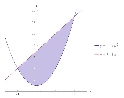 S = intlimits^2_{-1}{(3x+7-3x^{2}-1)} , dx  =intlimits^2_{-1} {(-3x^{2}+3x+6)} , dx   = (-3frac{x^{3}}{3} +3frac{x^{2}}{2} +6x)|_{-1} ^{ 2} = (-x^{3} +frac{3}{2} x^{2} +6x)|_{-1} ^{2} =-(8 - (-1))+frac{3}{2}(4-1) + 6(2 - (-1)) = -9+frac{9}{2}  +18=9+frac{9}{2} =frac{27}{2} =13.5