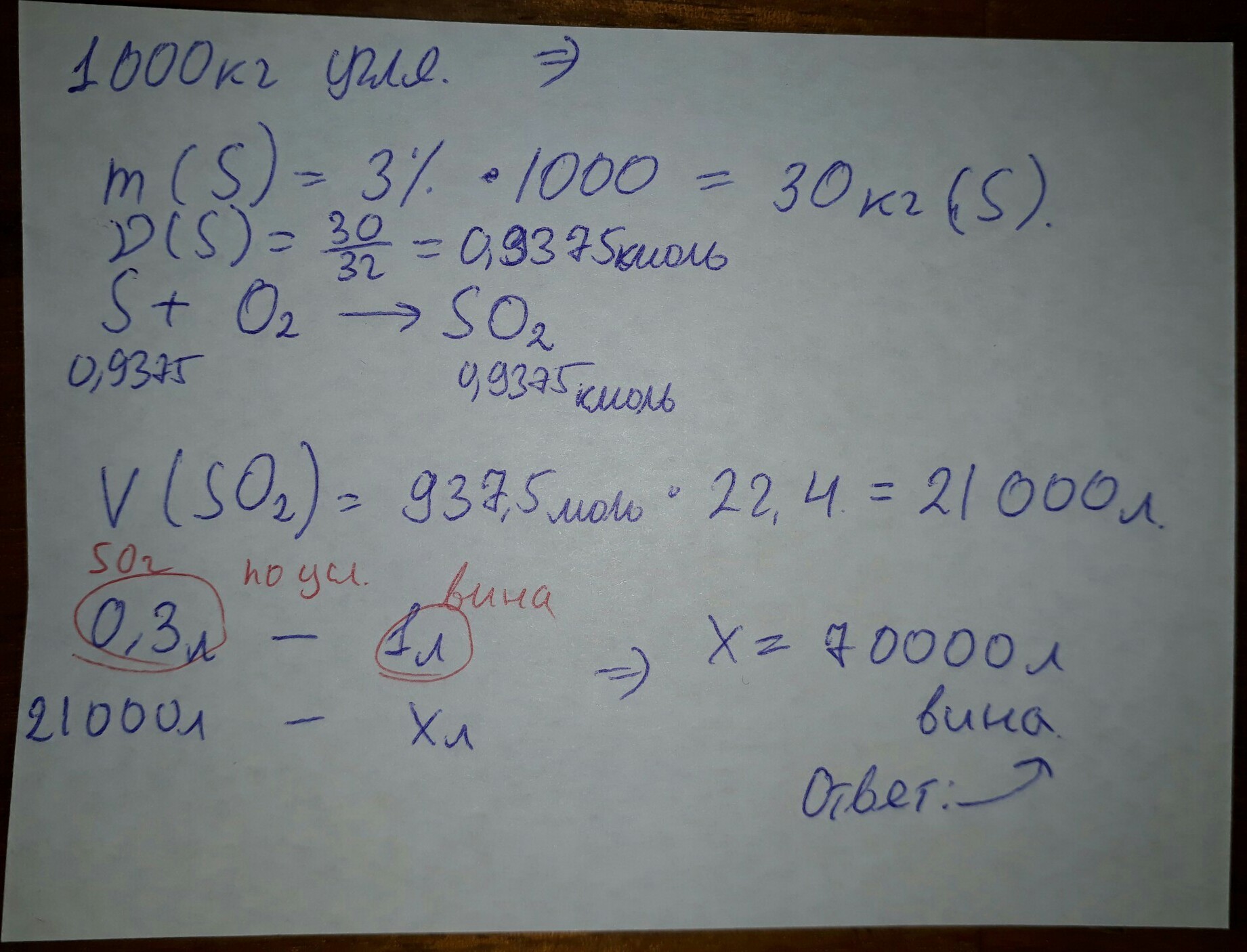 каменный уголь содержащий 3,0% серы сжигают и обращующийся при этом оксиды серы используют для консервации вина . сколько литров вина можно подвергнуть консервацииза счет сжигания 1 т угля, если требуемое содержание консерванта равно 300мл