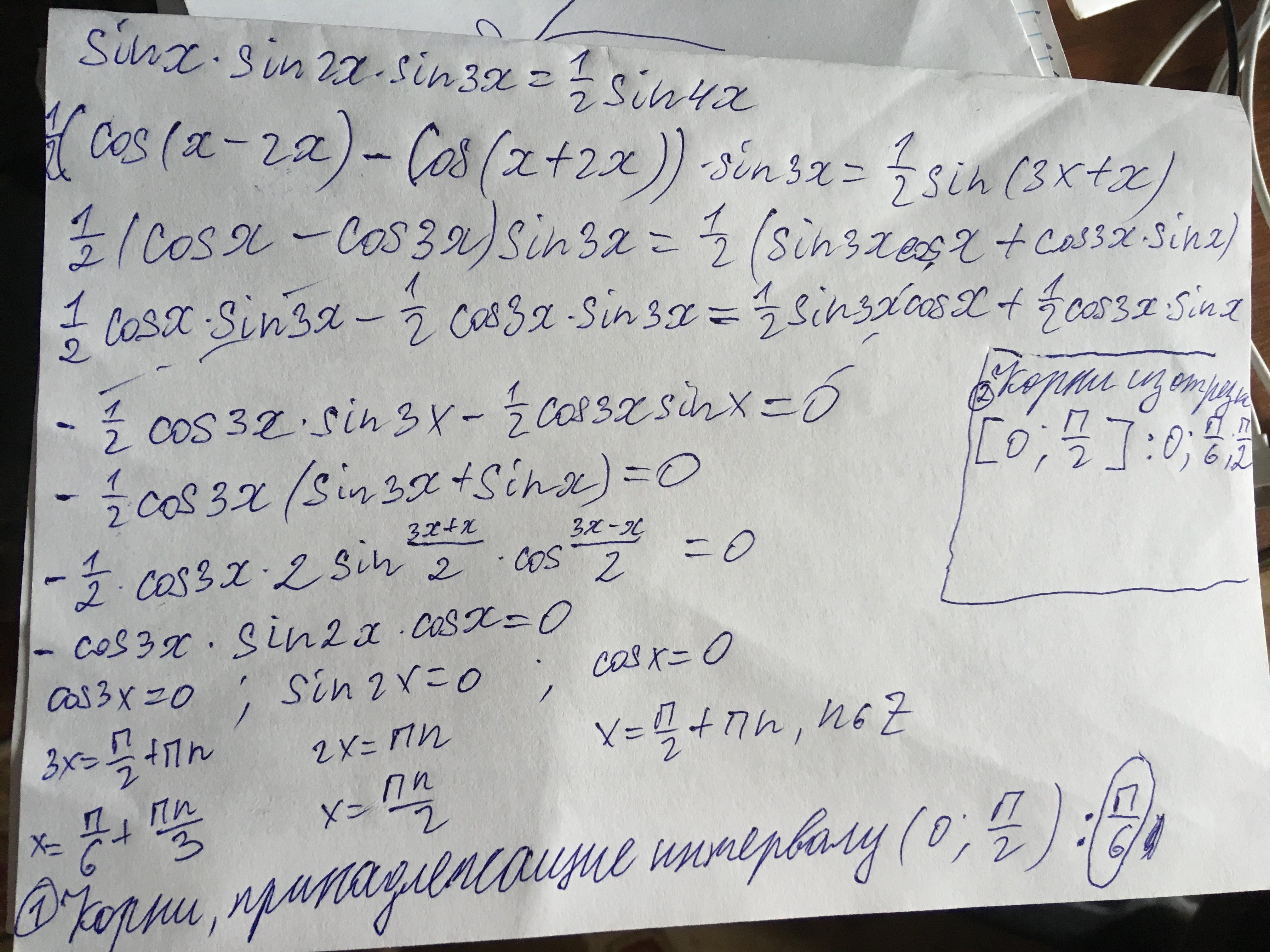 Решить уравнение sinx*sin 2x * sin 3x = 1/2 sin4x и найти все корни этого уравнения, принадлежащие отрезку ( 0;п/2)