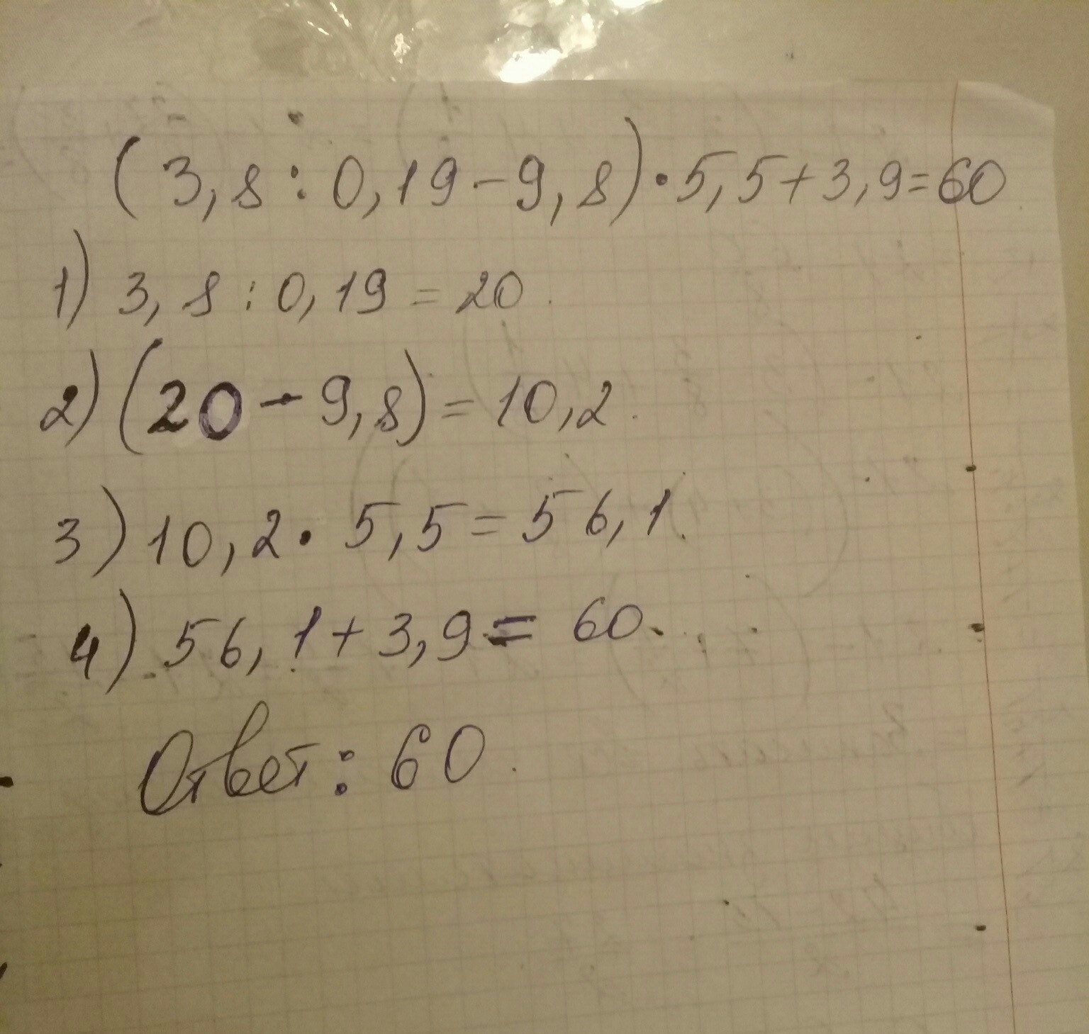 (3,8 : 0,19 - 9,8) * 5,5+3,9=60