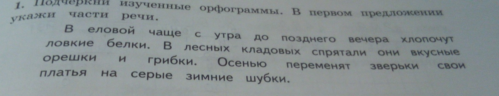 В (предлог) еловой (прилаг.) чаще (сущ.) с (предлог) утра (сущ.) до (предлог) позднего (прилаг.) вечера (сущ.) хлопочут (глагол) ловкие (прилаг.) белки (сущ.). В лесных кладовых спрятали они вкусные орешки и грибы. Осенью переменят зверьки свои платья на серые зимние шубки.