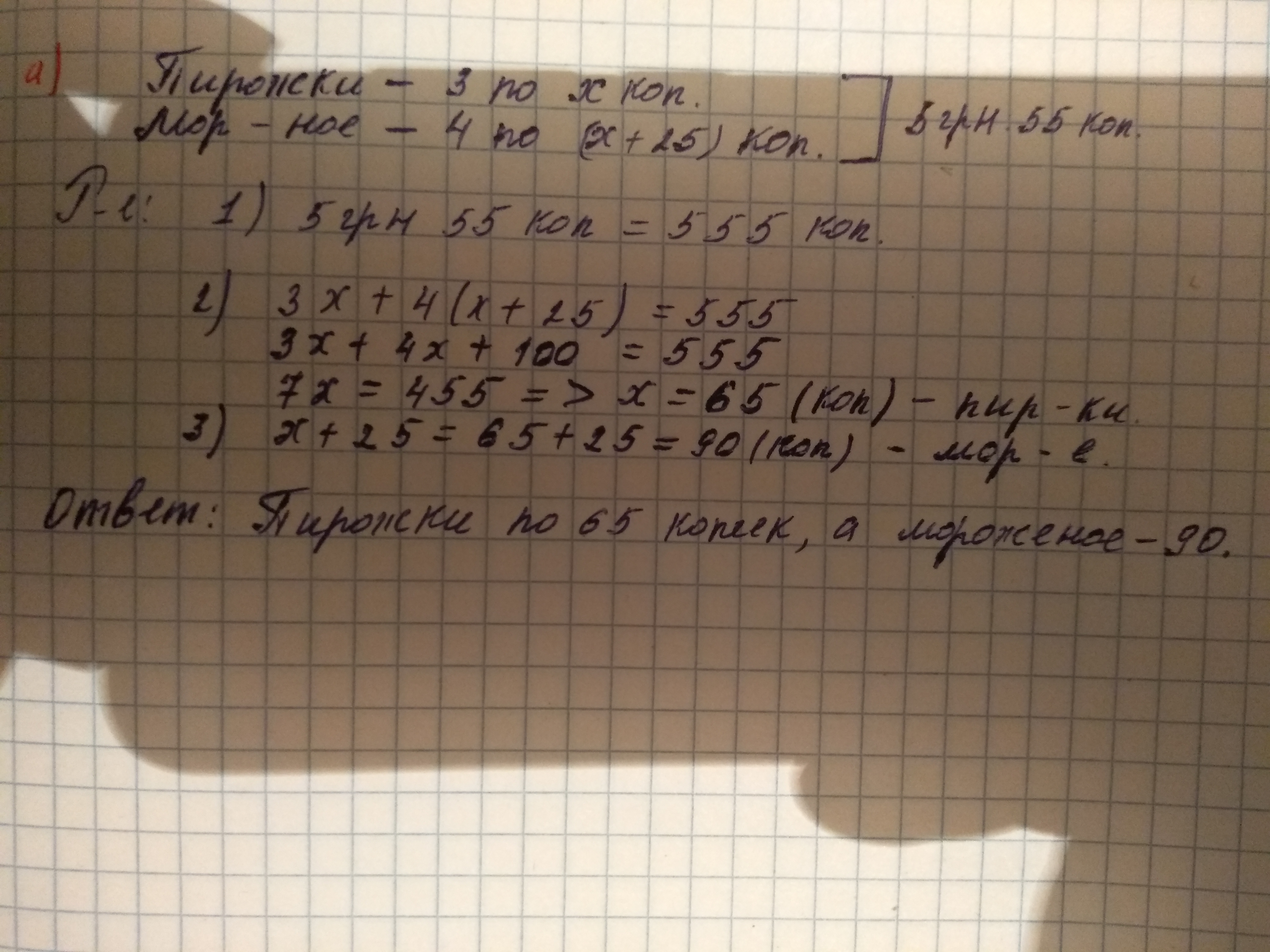 Задача: За 4 мороженых и 3 пирожка заплатили 5 грн55 коп.Сколько стоит мороженое и пирожок отдельно, если мороженое дороже от пирожка на 25 коп.
