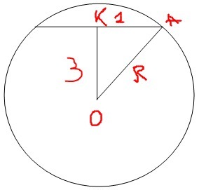 Довжину сторони квадрата, вписаного в коло, обчислимо за формулою a = √2·R. Як відомо, відстань від центра, радіус, проведений до кінця хорди, і половина хорди утворюють прямокутний трикутник, в якому радіус є гіпотенузою. За т. Піфагора, його довжина дорівнює √(9 + 1) = √10 см.