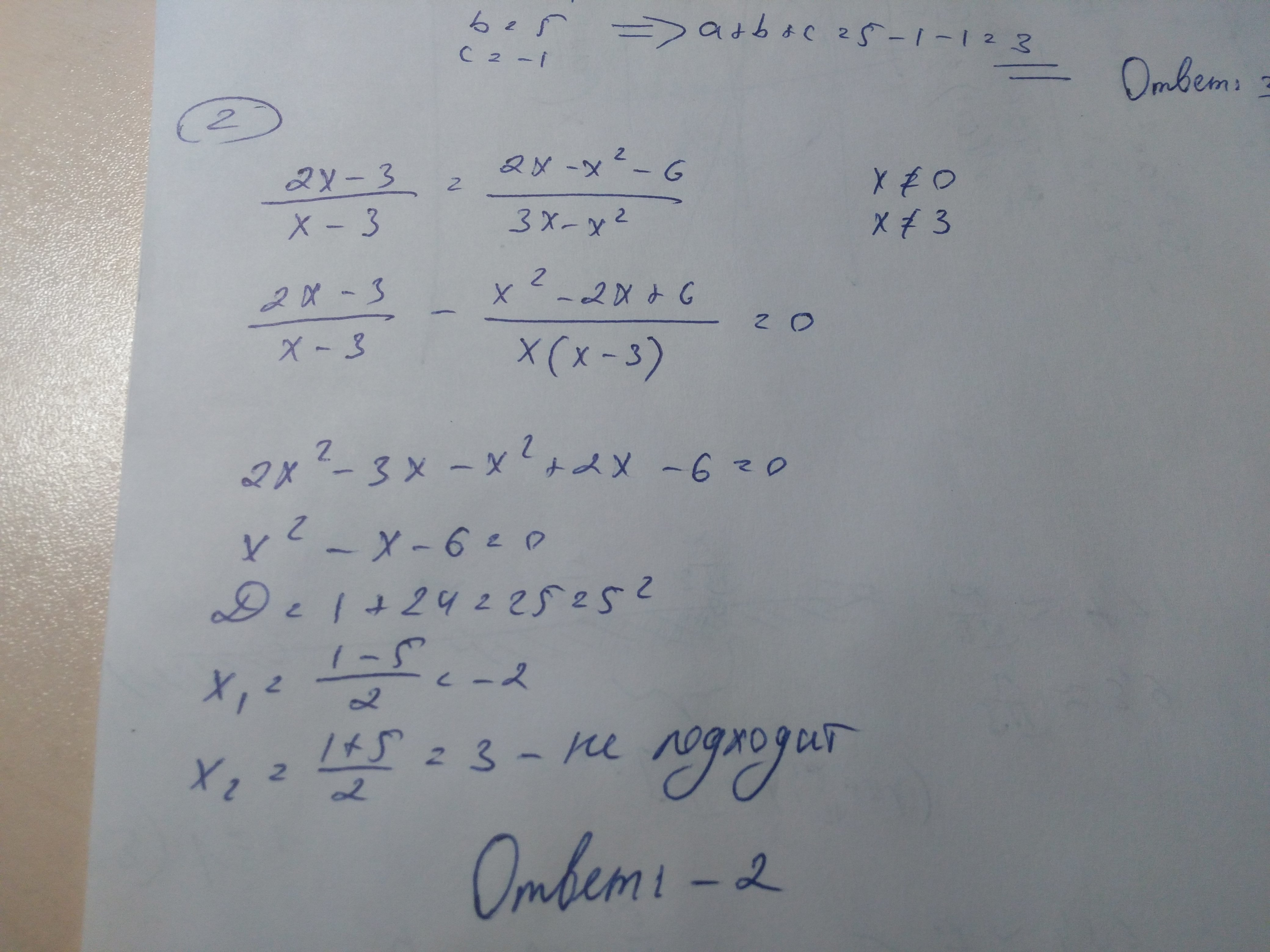 2. Найдите сумму корней или корень , если он единственный, уравнения (2x-3)/(x-3)=(2x-x^2-6)/(3x-x^2)