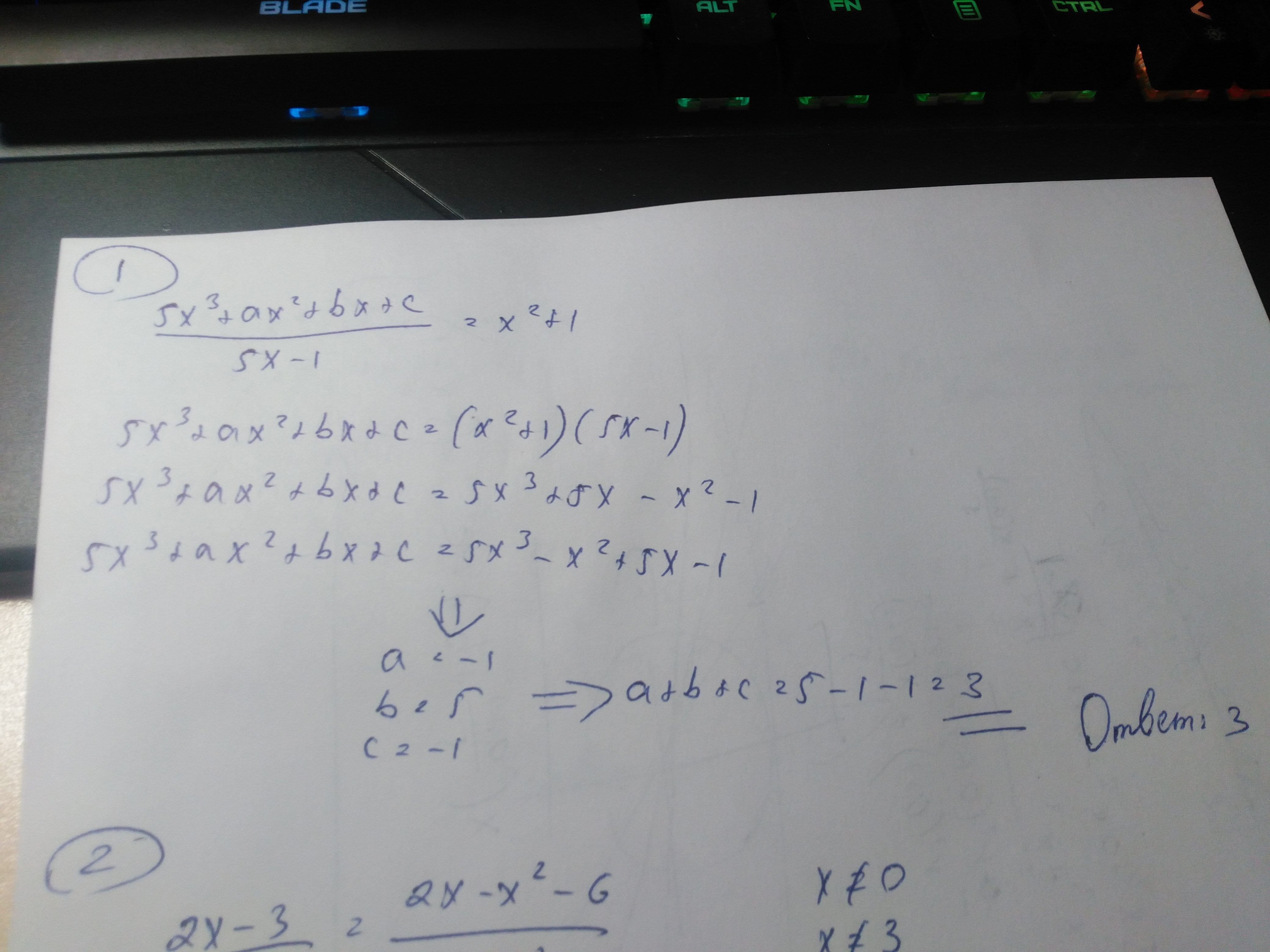 1. Найдите сумму a+b+c при условии, что выполняется равенство (5x^3+ax^2+bx+c)/5x-1 = x^2+1 для всех допустимых значений x.