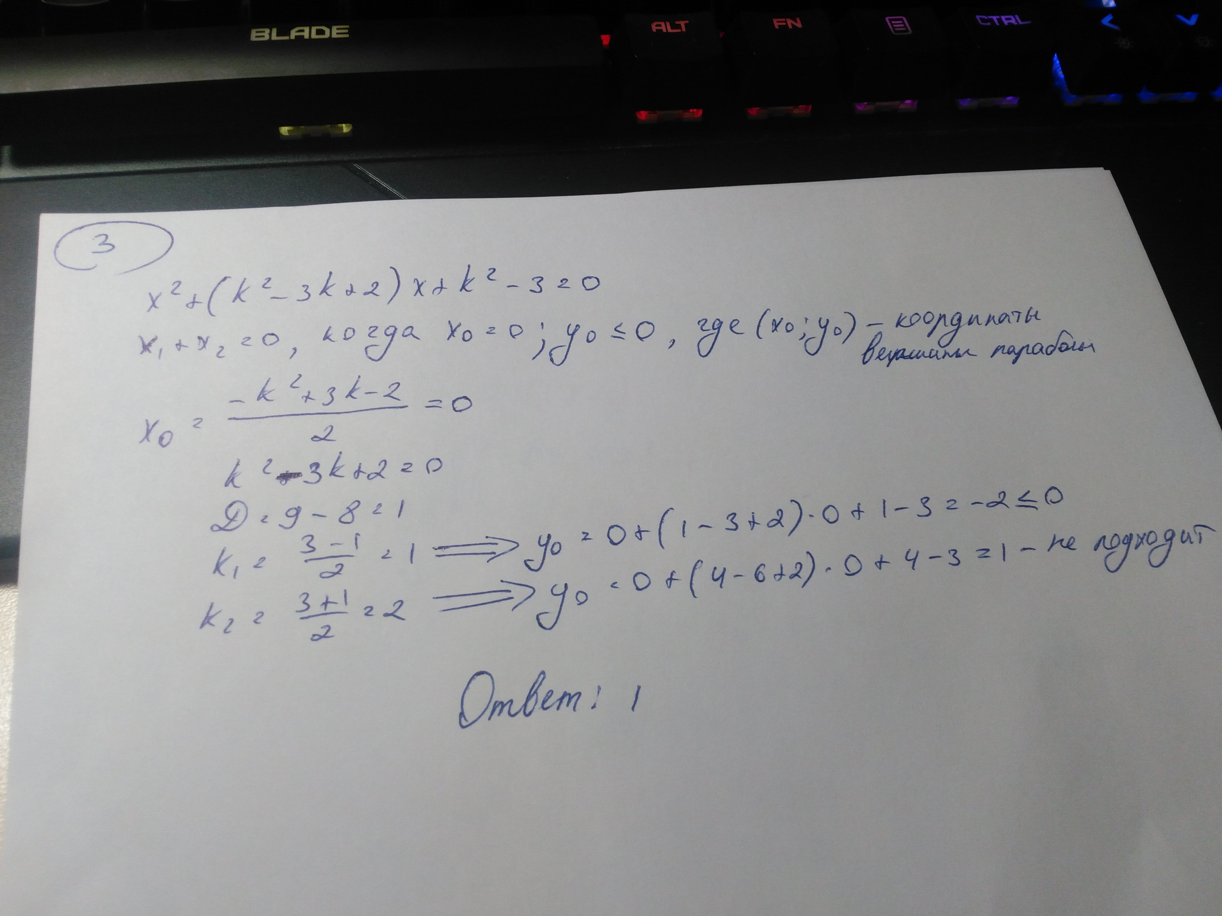 3. Найдите сумму значений k или значение k, если оно единственное, для которых сумма корней уравнения x^2+(k^2-3k+2)z+k^2-3=0 равна 0.