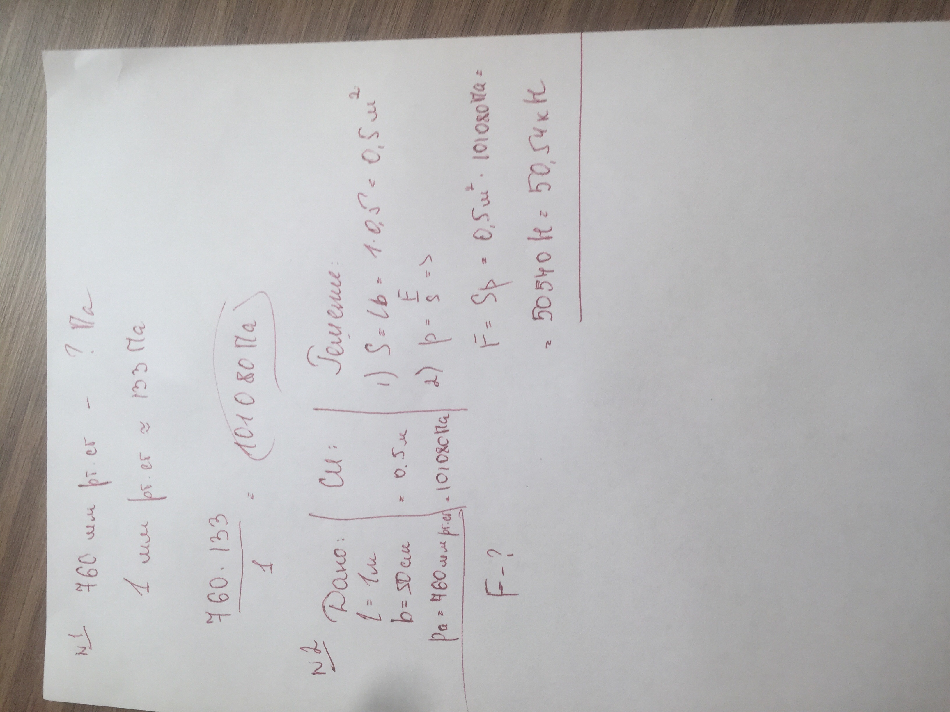 2. С какой силой воздух давит на крышу стола длиной 1 м и шириной 50 см при атмосферном давлении 760 мм рт.ст.? (Р ртути= 13600кг/м³)