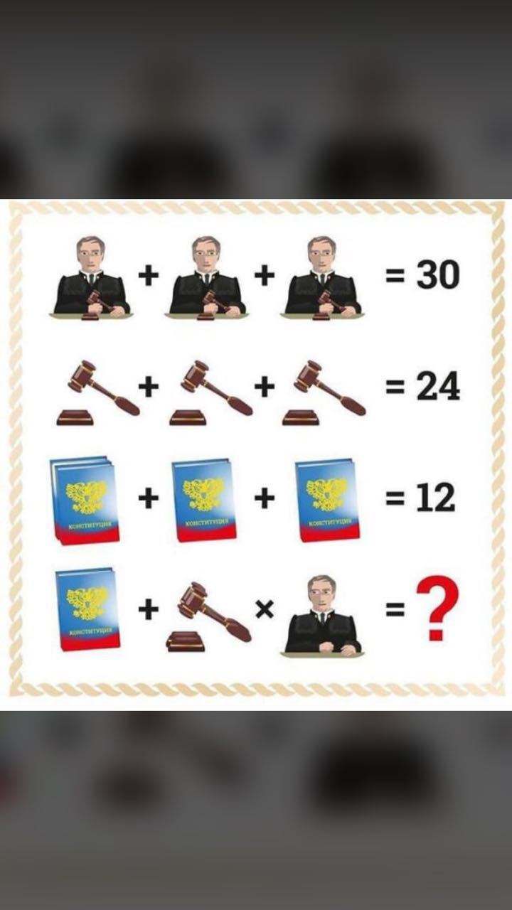 Судья с молотком это 10, сам молоток это 8, учитывая, что в третьем ряду сначала нарисовано две конституции, то вес конституции 3. Итого имеем: судья без молотка (10-8)=2, два молотка умножить на судью без молотка 16*2 и плюс одна конституция 3, Итого 35.