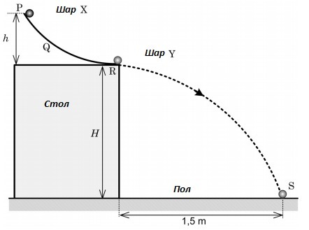 Кривая наклонная плоскость закреплена на столе. Шарик Х отпускают в точке Р. Он катится вниз и в точке R сталкивается с шариком Y. После абсолютно упругого соударения шарик Y начинает горизонтальное движение со скоростью 3м/с и падает на пол в точке S. Шарики одинаковые. Сопротивление воздуха не учитывать.