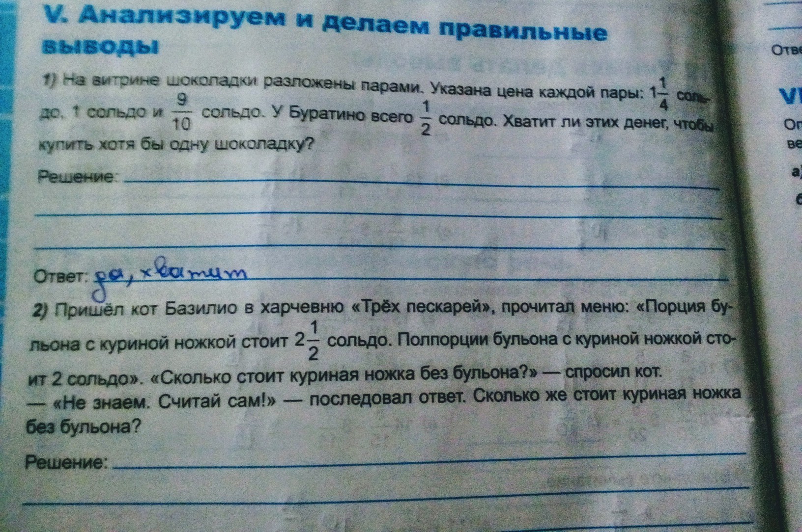 1) да, хватит купить 1 шоколадку, т.к. у Буратино половина сольдо, а шоколадка продаётся парами 1 сольдо, 9/10 сольдо