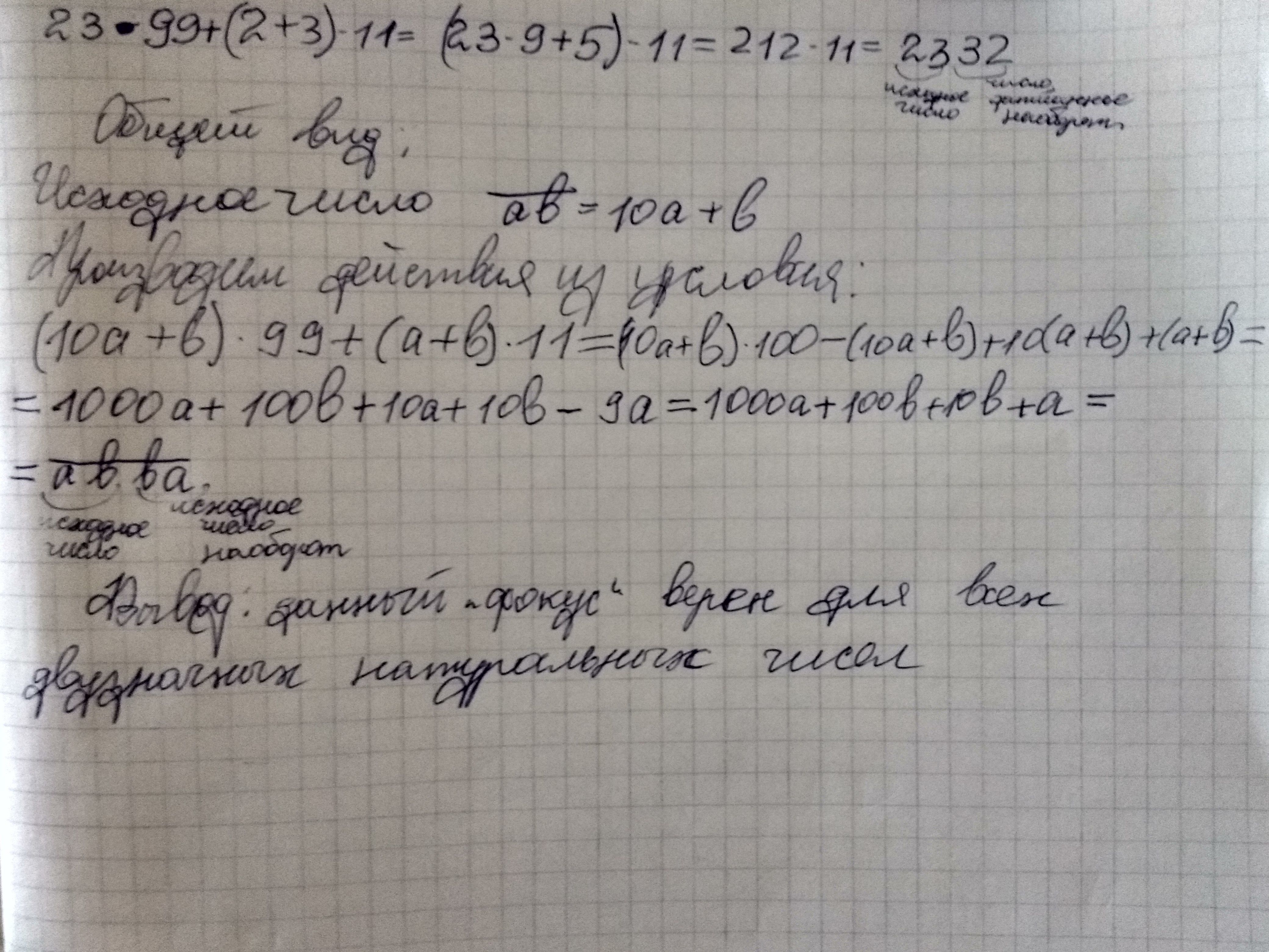 Миша задумал число 23 и умножил его на 99. К полученному числу он прибавил сумму цифр числа 23, помноженную на 11. Сформулируйте гипотезу насчёт фокуса и объясните ее