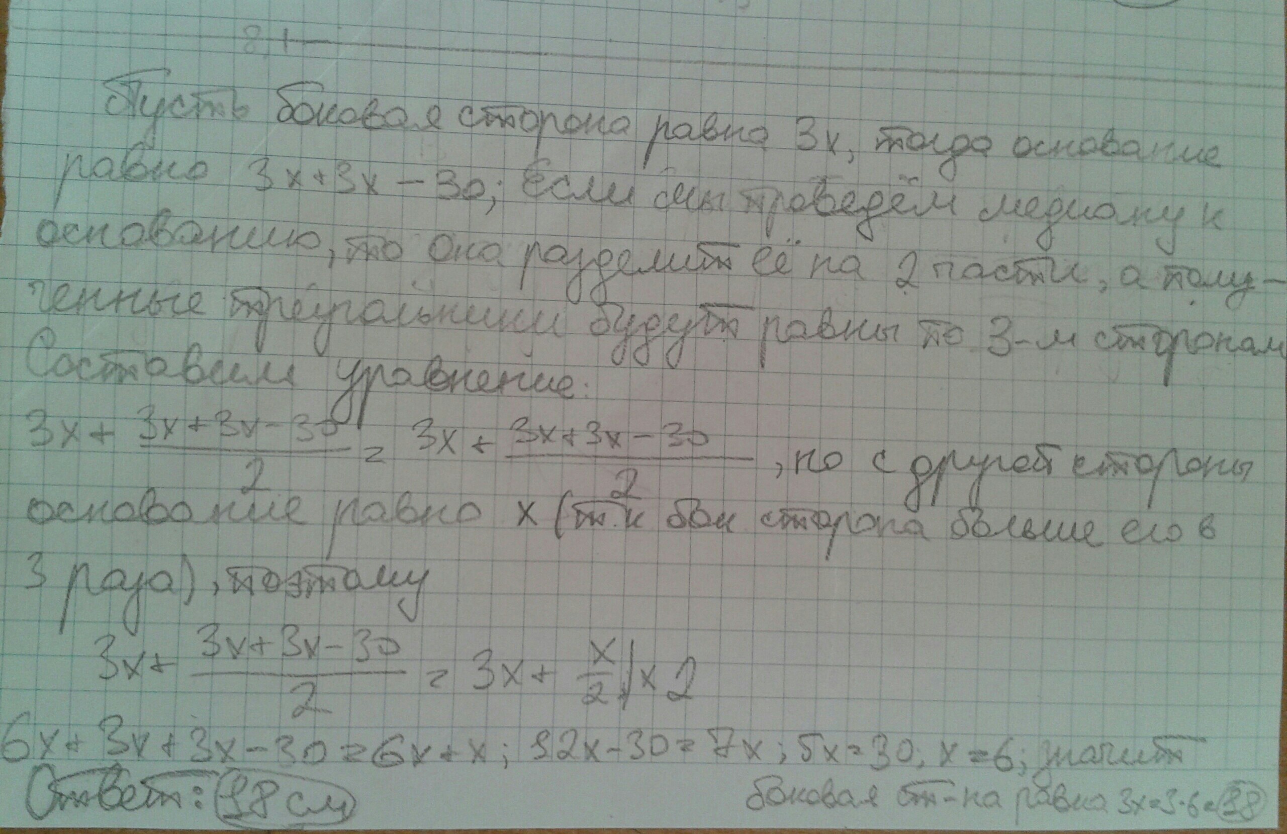В равнобедренном треугольнике боковая сторона больше основания в 3 раза, основание меньше суммы боковых сторон на 30 см. Найдите боковую сторону.