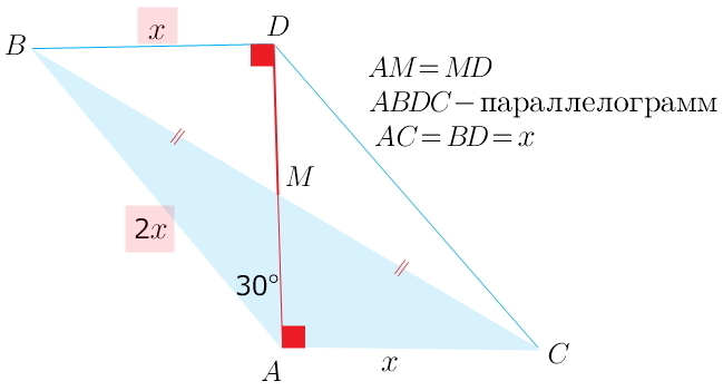 если продолжить медиану на ее же длину, то треугольник достроится до параллелограмма... в получившемся треугольнике ABD "легко" заметить, что сторона против угла в 30° равна половине другой стороны... это верно только для прямоугольного треугольника)) и ∠BDA=∠CAD как накрест лежащие при параллельных АС и BD и секущей AD...