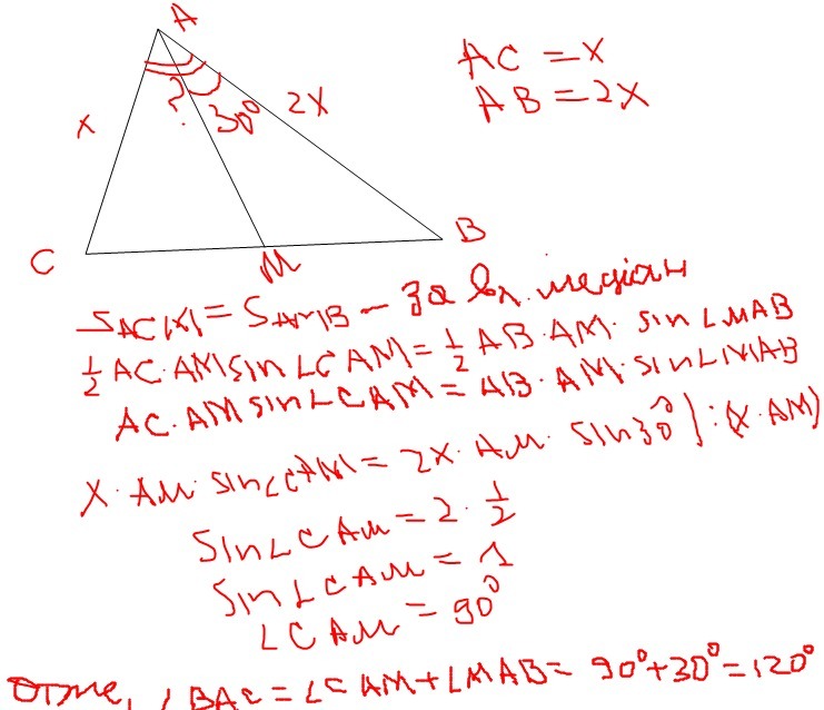 медиана делит треугольник на два равновеликих треугольника (у них площади равны): 0.5*АВ*АМ*sin(30°) = 0.5*AC*AM*sin(x)