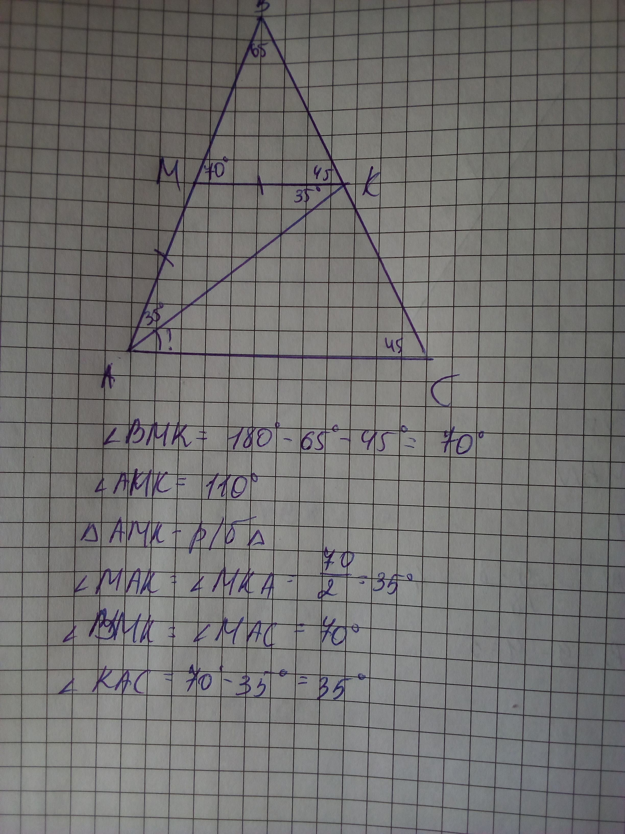 Прямая, параллельная стороне AC треугольника ABC, пересекает его стороны AB и BC в точках M и K так, что AM=MK. Известно, что угол B = 65°, угол C=45°.