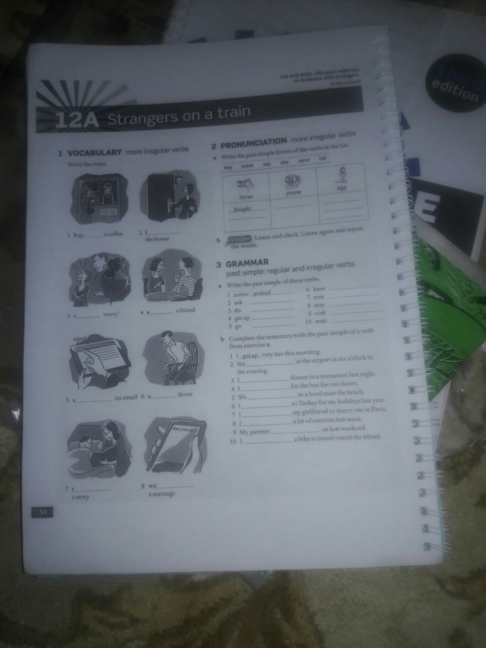 1) Leave the house, say sorry, speak a friend, sand an email, sit down, tell a story, write a message. 3)a; asked, did, got up, went, had, rented, stayed, visited, waited, b; arrived, had, waited, stayed, went, asked, did, visited, rented