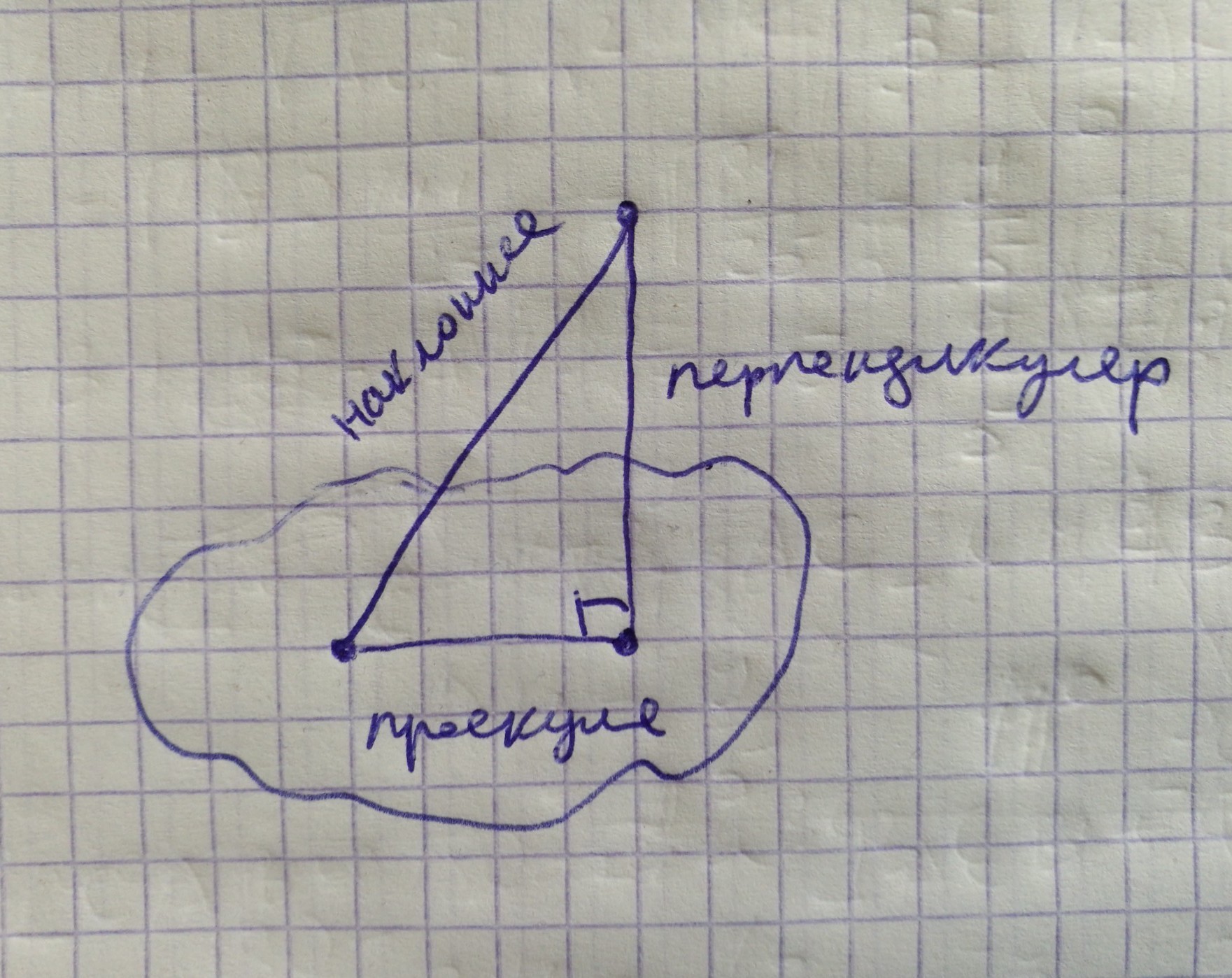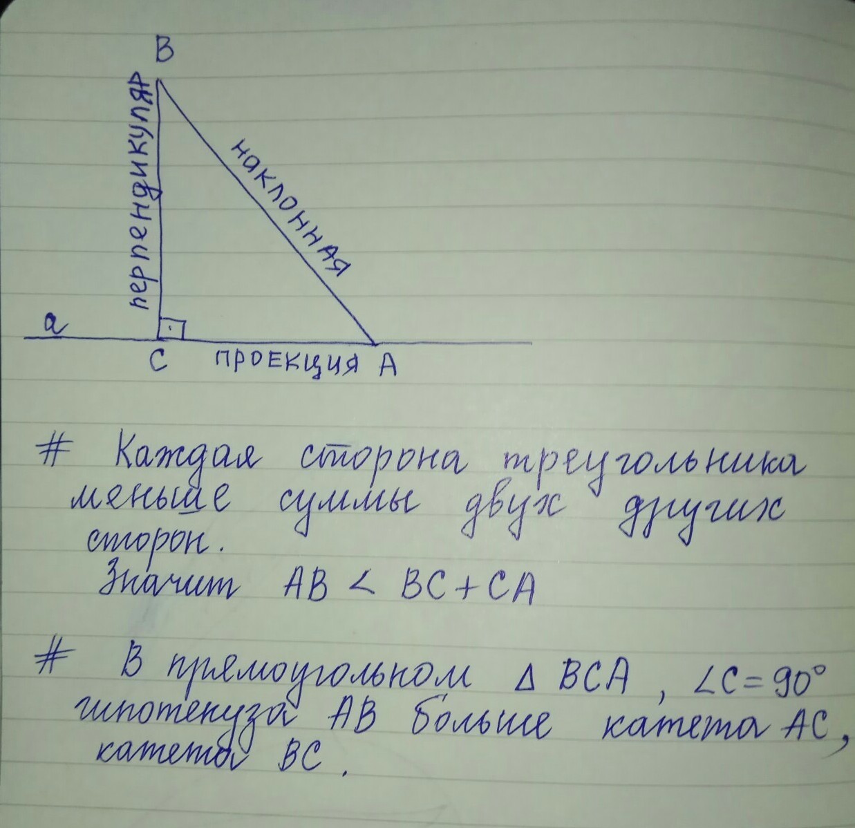 наклонная больше проекции и больше перпендикуляра, потому что гипотенуза больше любого катета