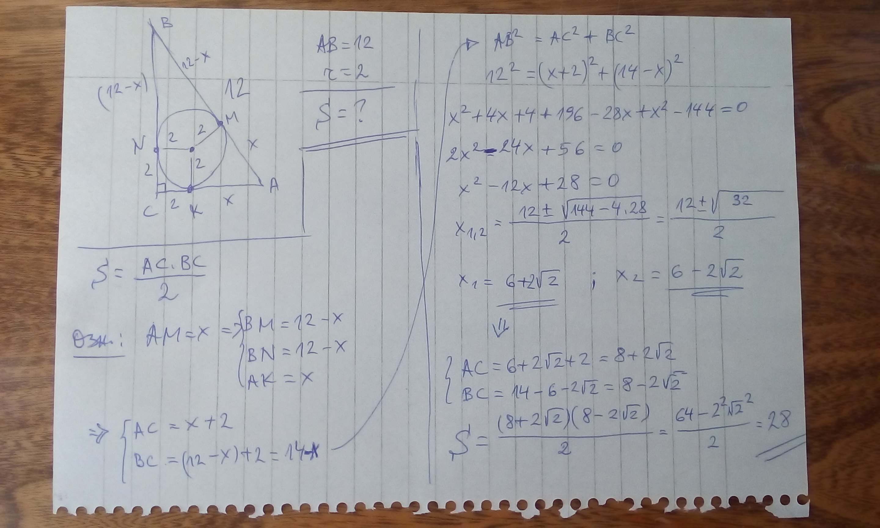 В прямоугольном треугольнике гипотенуза равна 12, а радиус вписанной