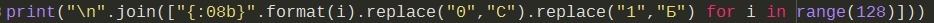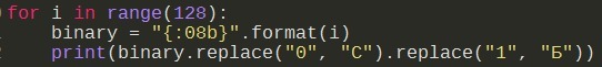 Есть несколько способов напечатать все возможные варианты. Например, для каждого числа от 0 до 127 найти его двоичное представление и заменить 0 на "С" и 1 на "Б".