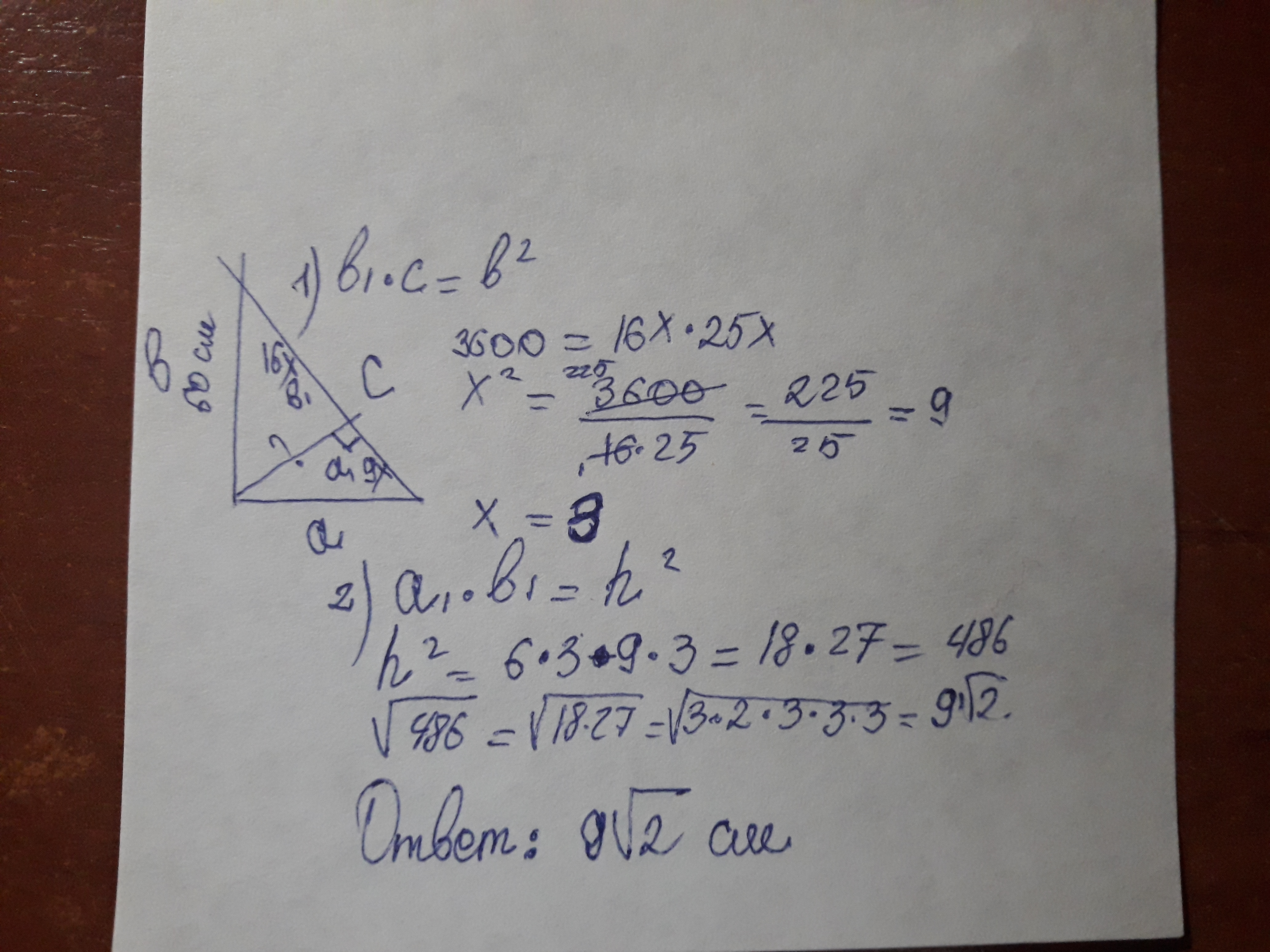 Креплю решение в виде фото. Использовала метрические соотношения в прямоугольном треугольнике