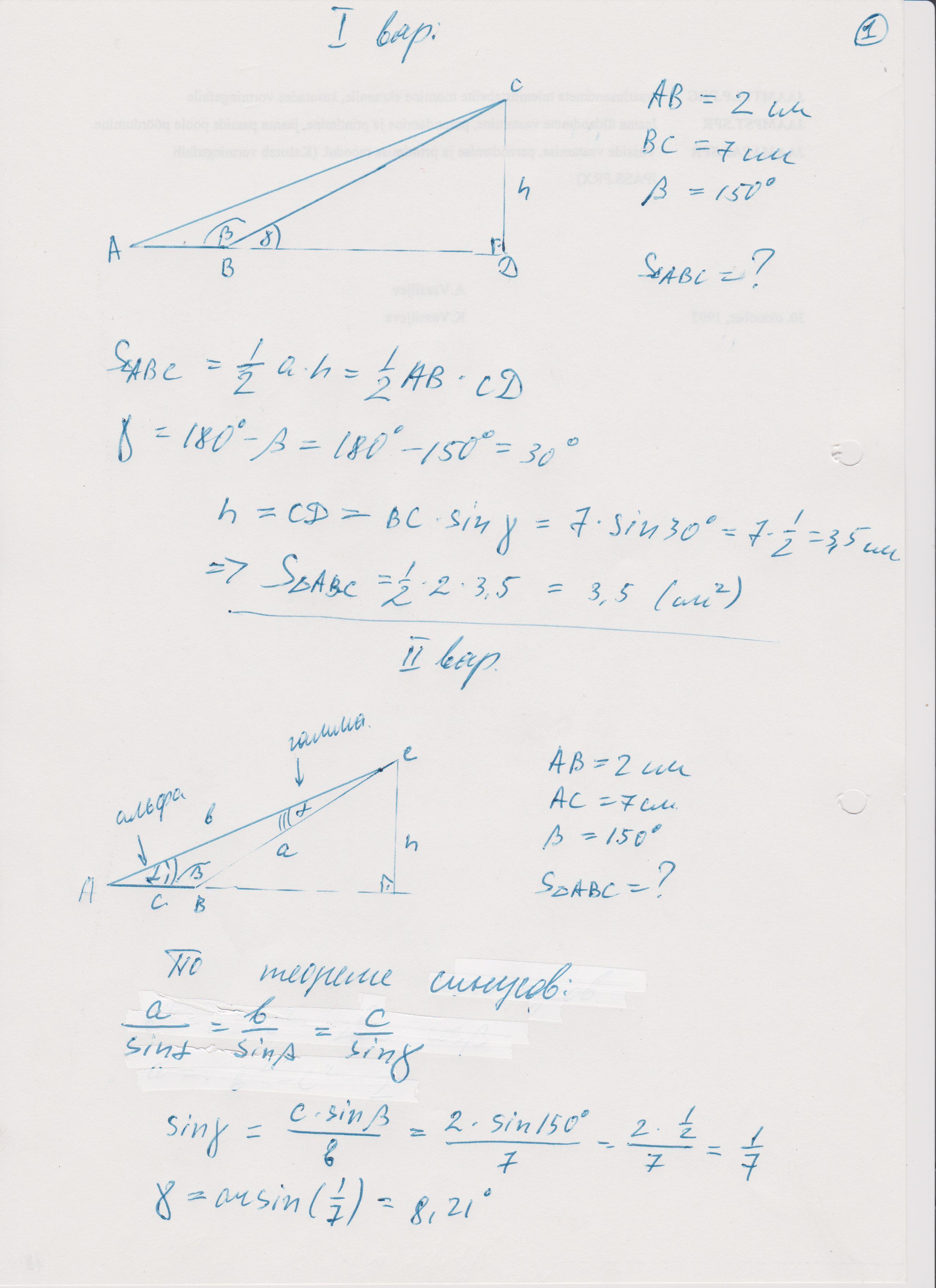 Один из углов треугольника 150 градусов, а две из его сторон равны 2 и 7 см. Найти все возможные значения площади треугольника.
