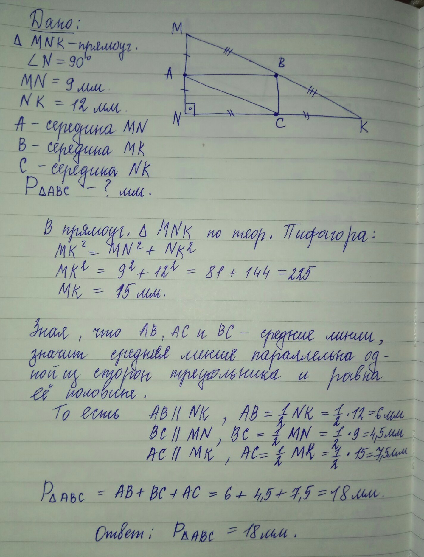 найдите периметр треугольника ,вершинами которого являются середины сторон прямоугольного треугольника MNK с катетами 9мм и 12мм