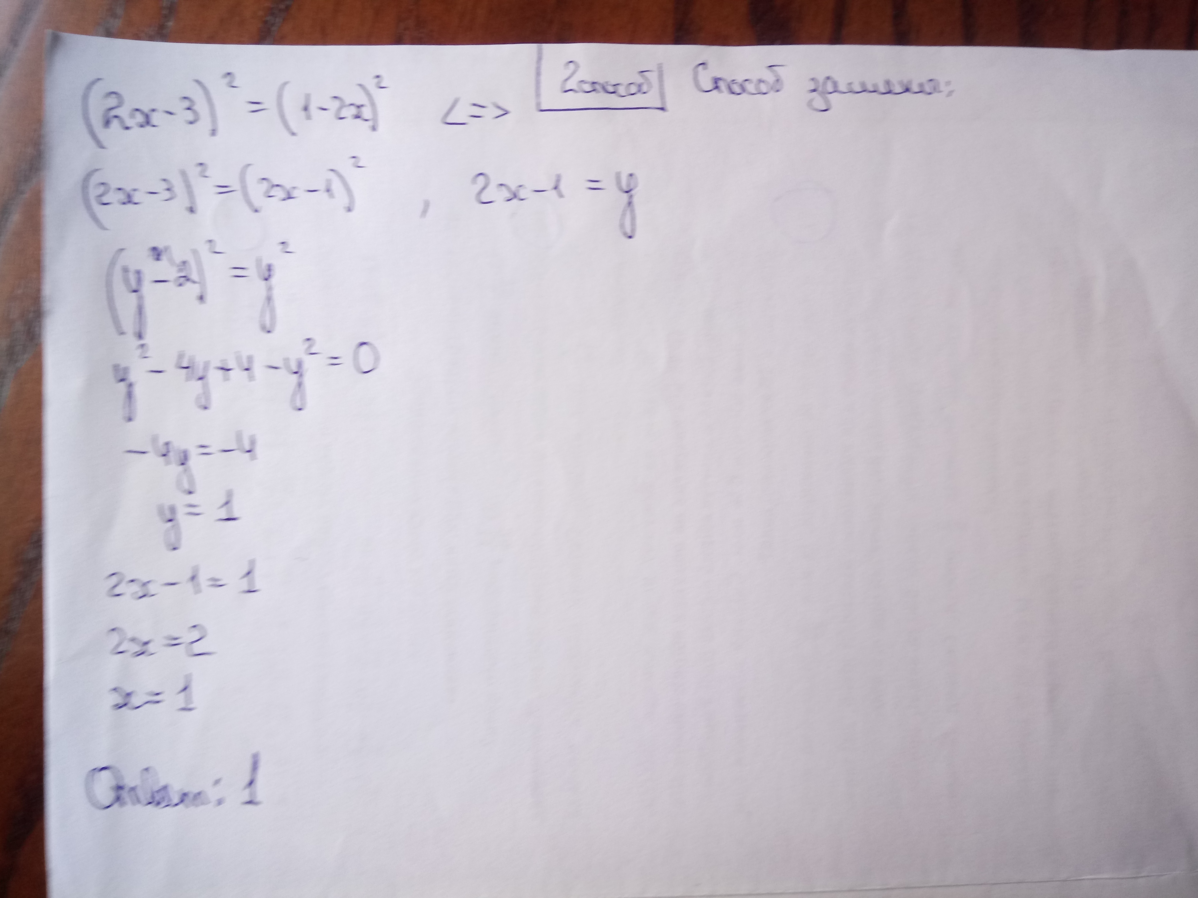 еще есть третий способ: применить формулу "разность квадратов"... (2х-3 - (1-2х))*(2х-3 + 1-2х) = 0 ---> 4x-4 = 0