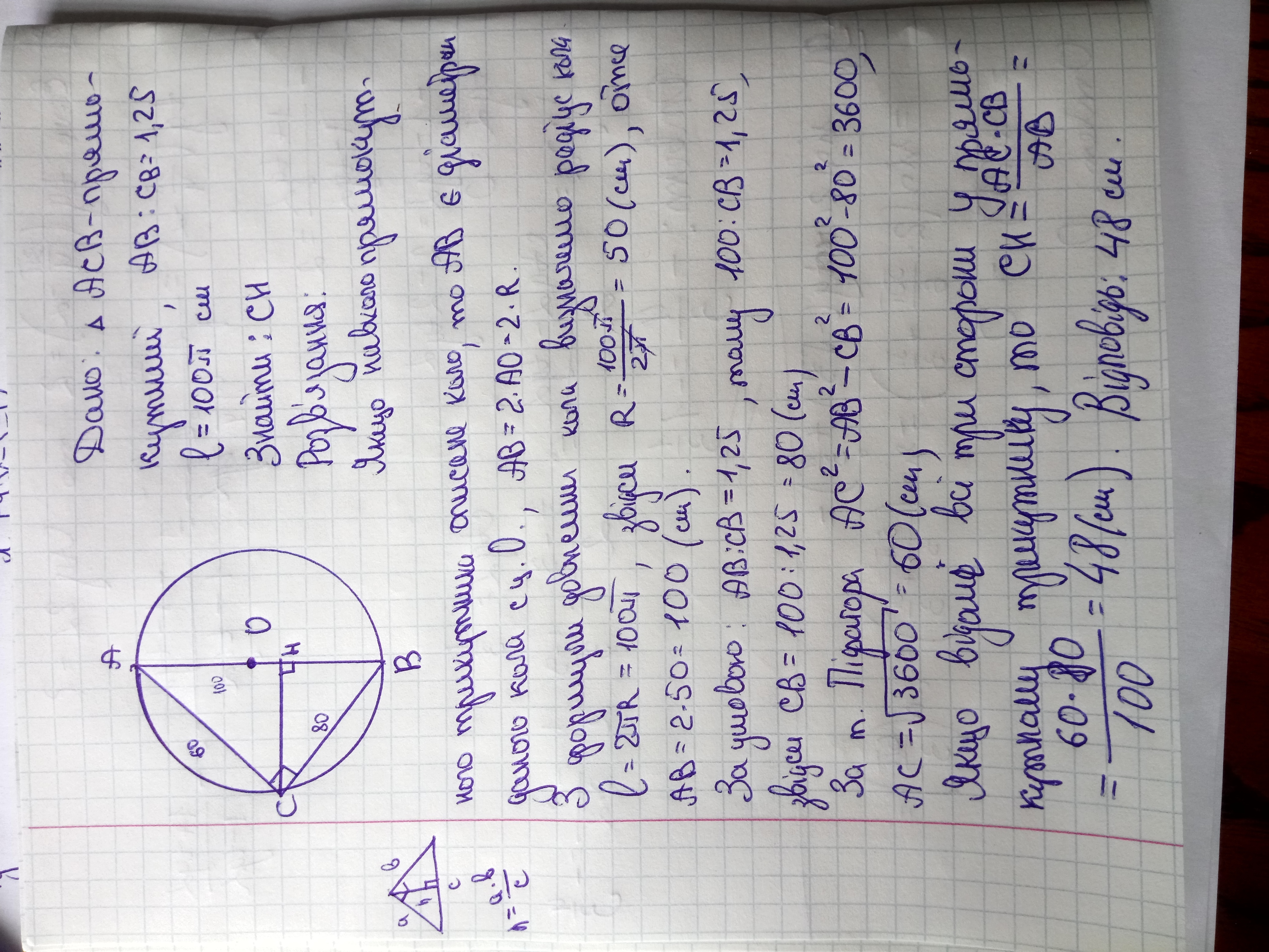 Відношення гіпотенузи до катета дорівнює 1,25.Довжина описаного кола 100П см . Бочисліть висоту, опущенну на гіпотенузу