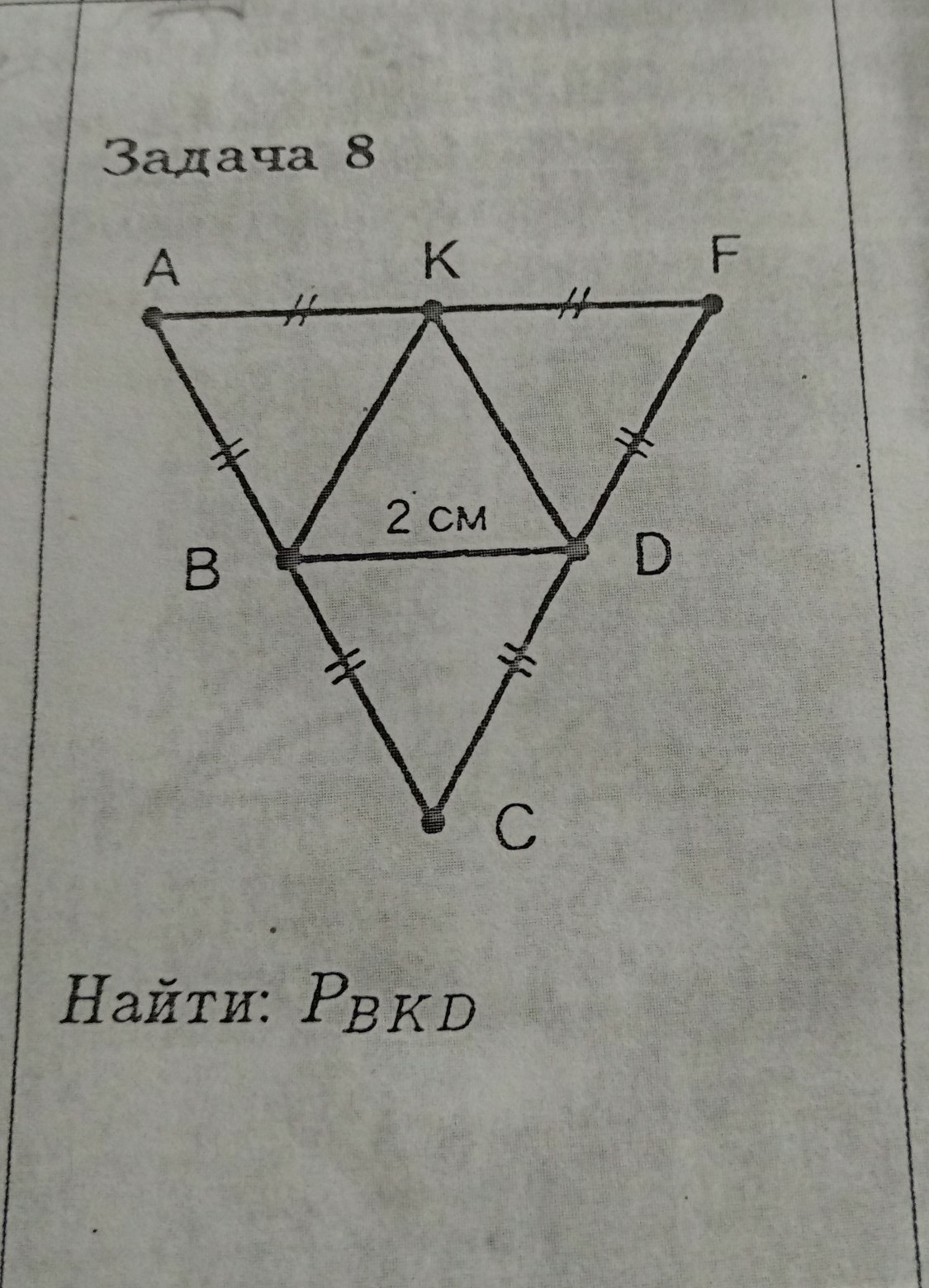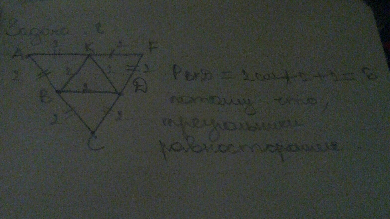 Треугольники равносторонние,а BD -является средней линией.Поэтому AF=2•2=4 Значит:AK=KF=FD=AB=BC=CD=KB=KD=2см P(BKD)=2+2+2=6