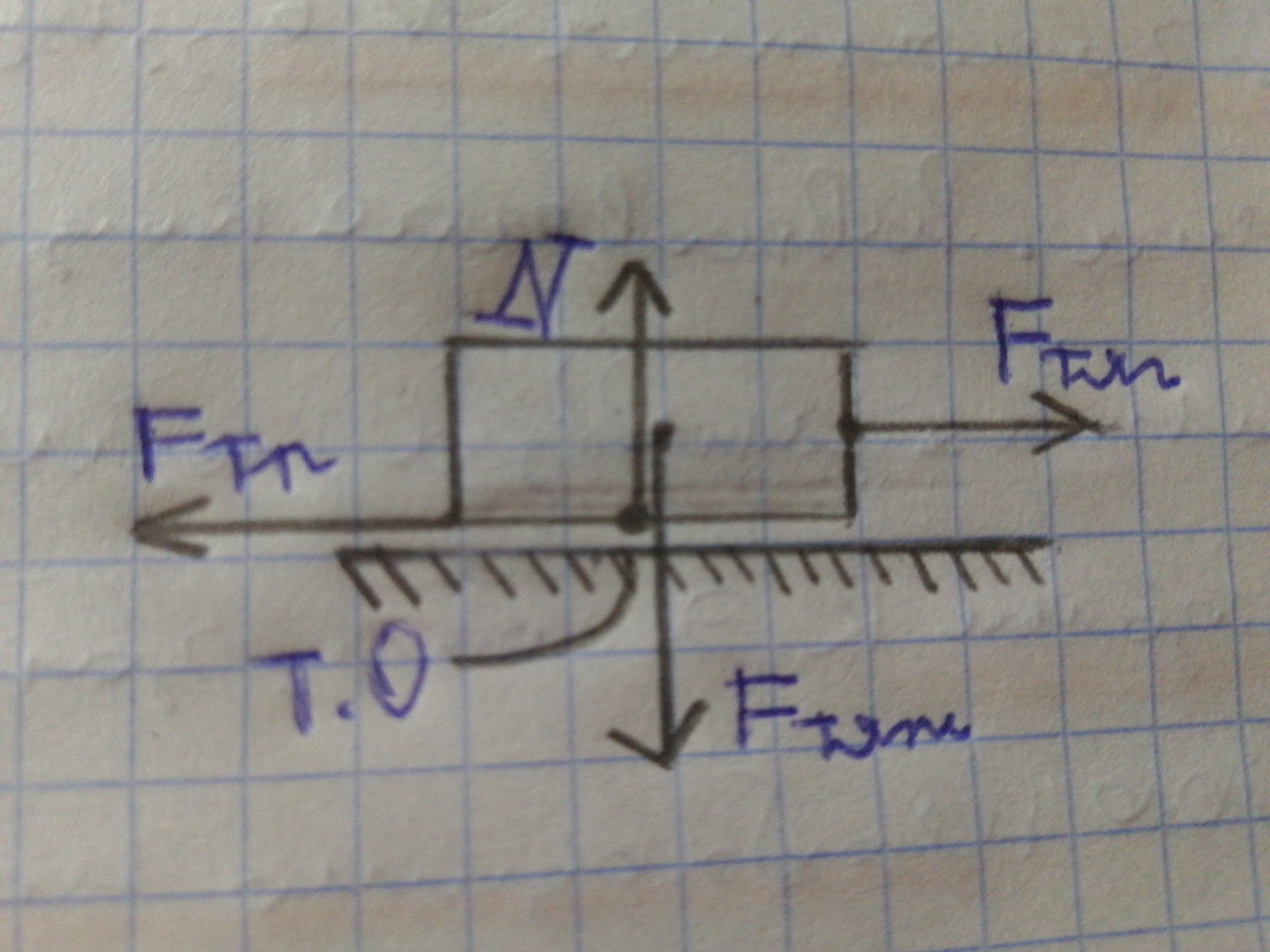 На фото я обозначил буквой N силу реакции опоры, буквой Fтяж — силу тяжести, она всегда приложена к центру тела и направлена вертикально вниз, буквой Fтяг — силу тяги, то есть силу, с которой тянут тело, а буквой Fтр — силу трения, возникающую в процессе движения, она всегда должна быть приложена к телу к его точке соприкосновения с поверхностью, а направлена противоположно силе тяги. Если записать правило моментов относительно точки O, то плечо, а следовательно и вращающий момент имеет только сила тяги, следовательно тело обязано вращаться. Но ведь это не так. Значит сила реакции опоры (сила упругости) направлена в данном случае не к центру тяжести тела, а смещена относительно него?
