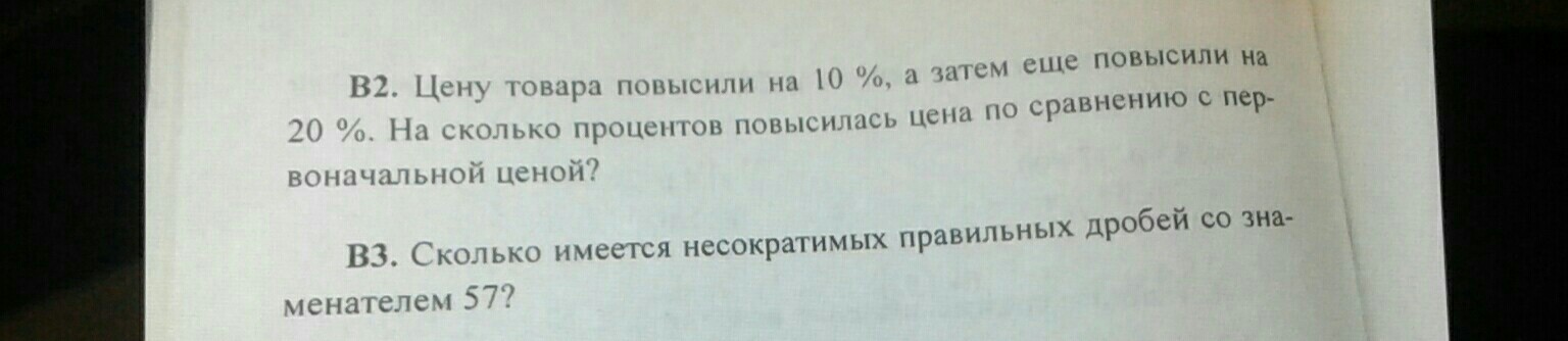 В2. Пусть начальная цена будет х, тогда после первого повышения она составляет 110% от начальной и равна 1,1х. После второго подорожания на 20% цена товара составляет 120% от 1,1х и равняется 1,2·1,1х = 1,32х. Значит окончательная цена составляет (1,32х/х)·100% = 132% от начальной и увеличилась на 132% - 100% = 32%. Ответ: 32%.