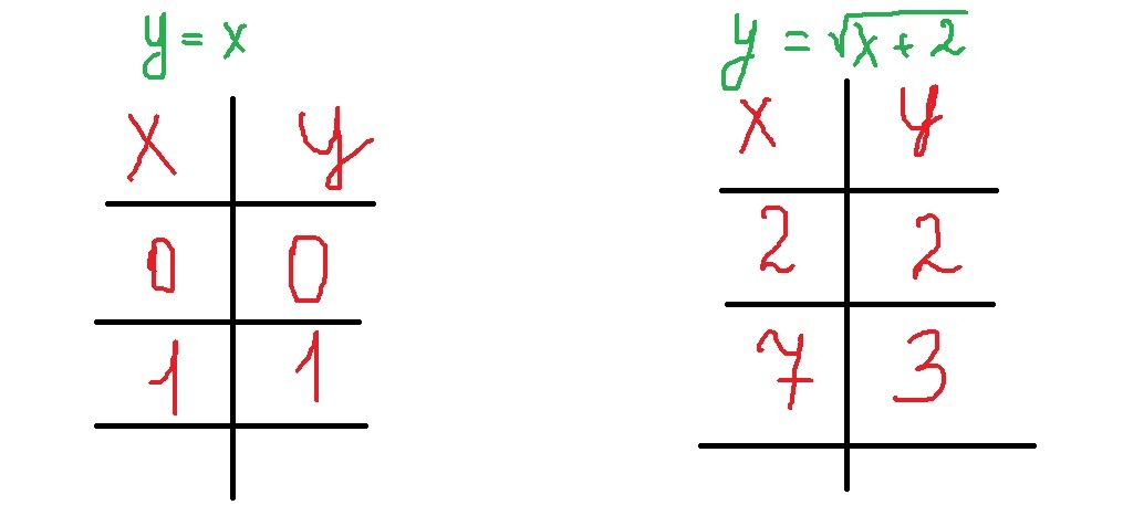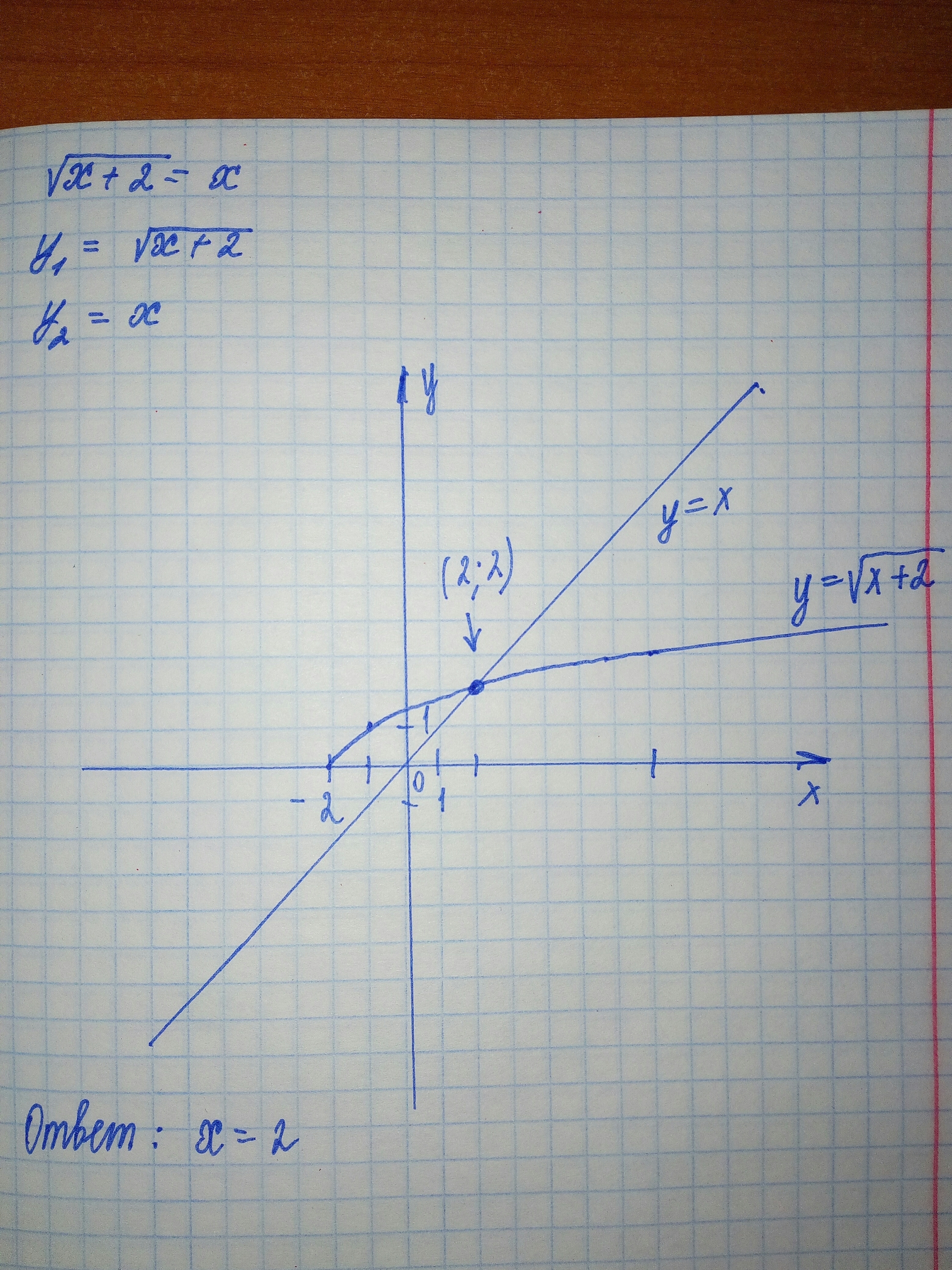 а если вы хотите решить без графиков, то возведите обе части в квадрат, но не забывайте про область определения. x+2≥0, т.к под корнем, и x≥0, потому что х равен корню, значение которого ≥0