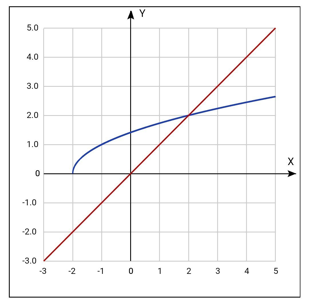 Строим функцию y=√x ,смещенную на 2 единицы влево и в этой же системе строим функцию y=x. Как мы видимо,функции пересекаются в точке (2;2)