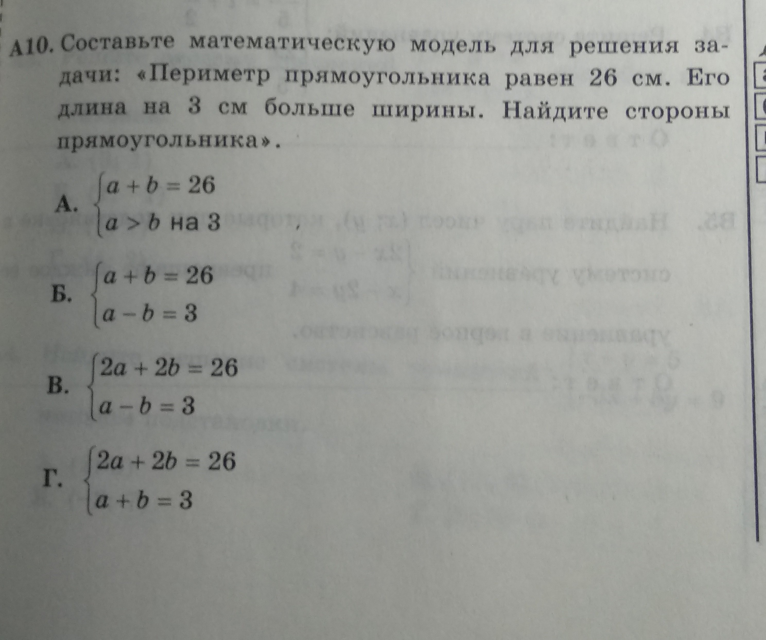 Составьте математическую модель для решения задачи: «Периметр прямоугольника равен 26 см. Его длина на 3 см больше ширины. Найдите стороны прямоугольника»