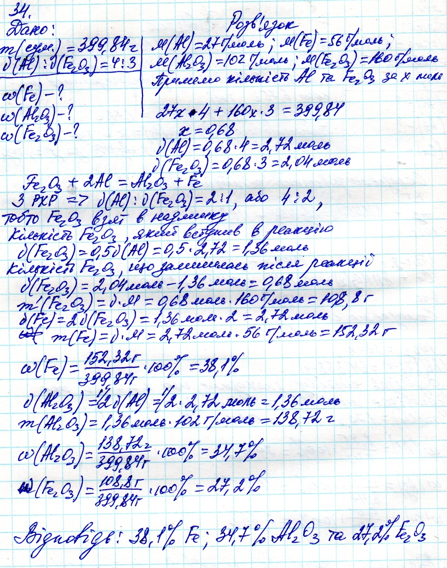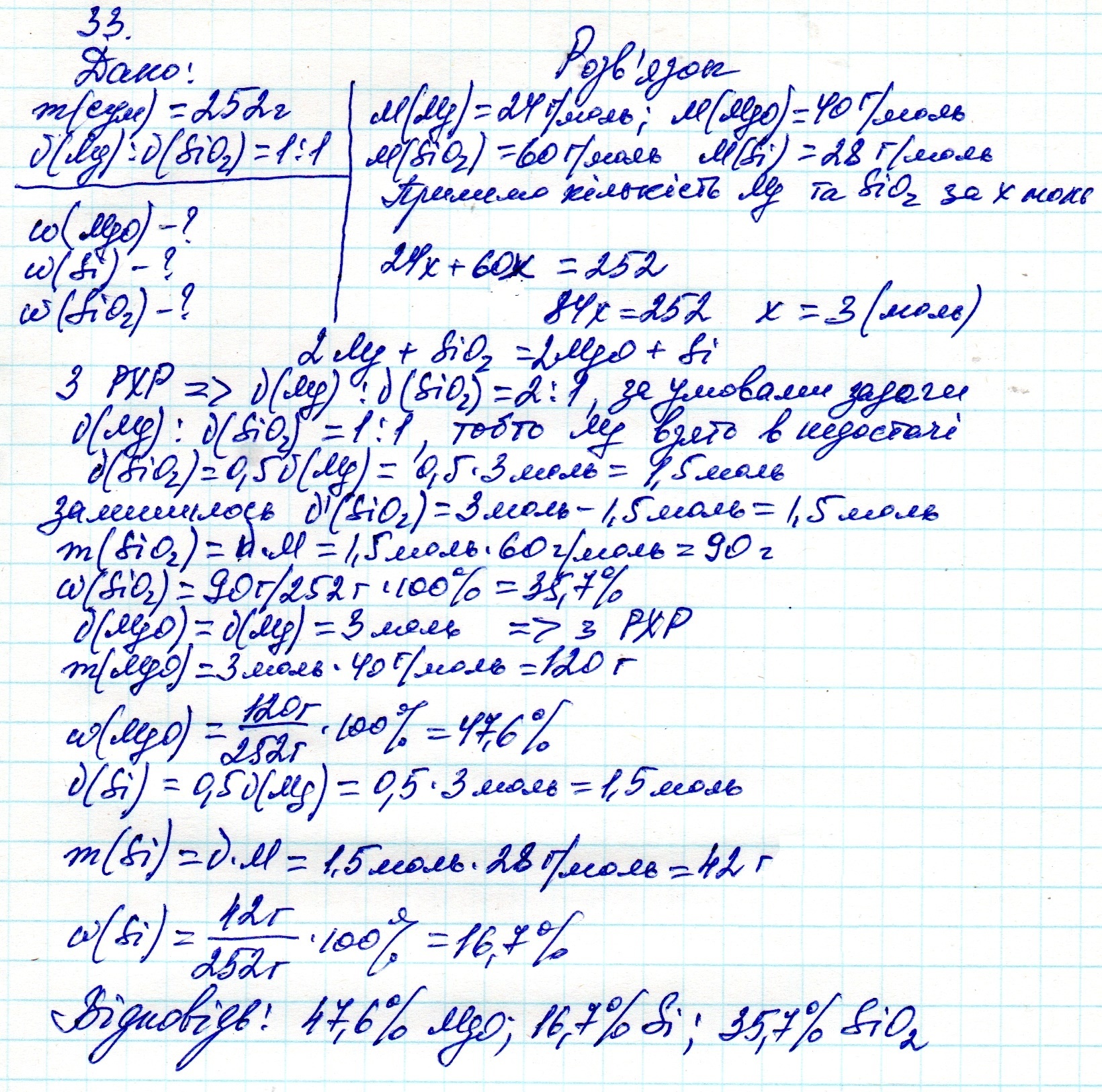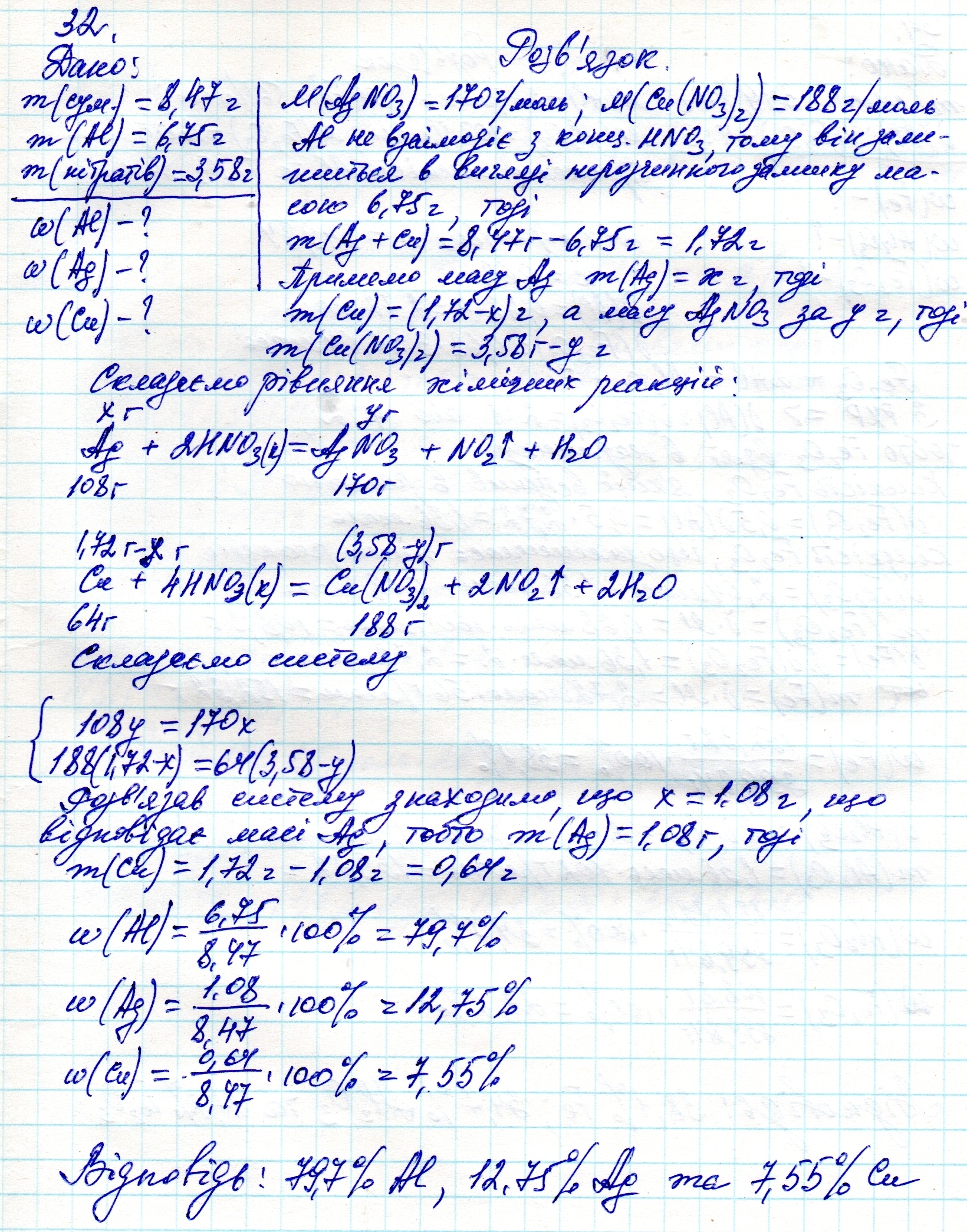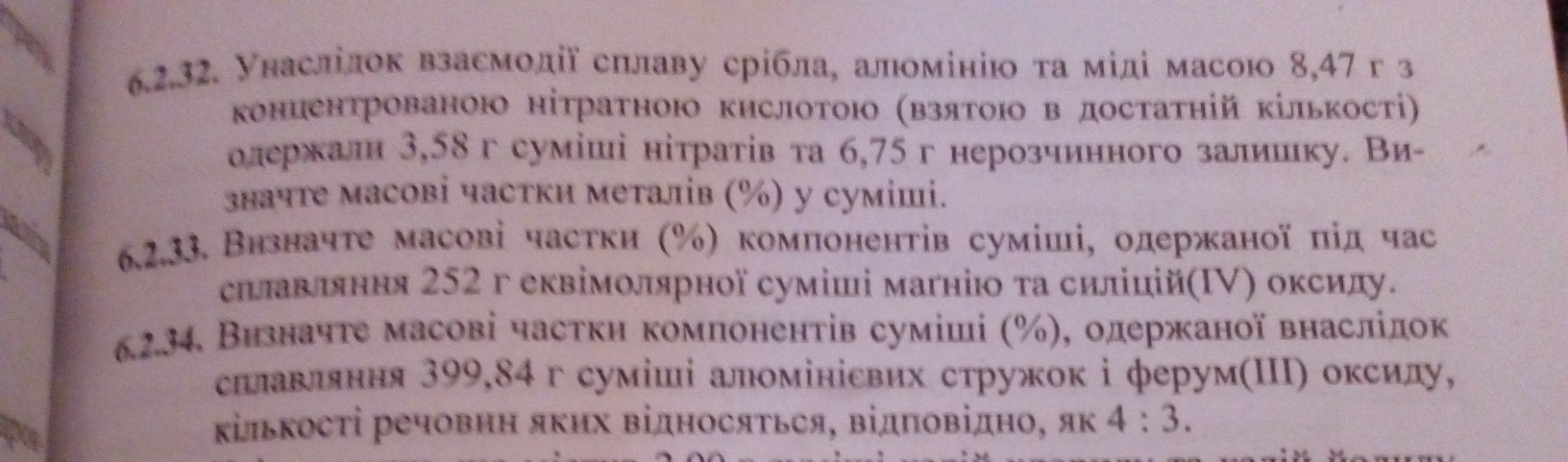 в результате взаимодействия сплавы серебра алюминия и меди массой 8. 47 г вместе с концентрированной азотной кислотой взятой достаточного количества получили 3 .58 г смеси нитратов и 6. 75 грамм раствора с остатком определить массовые доли металлов в смеси 33) определите массовые доли компонентов смеси полученной во время плавления 252 грамма эквимолярных смесь или магния и кремния 4 оксид 34 (определите массовые доли компонентов смеси полученные в результате сплавления 399. 84 грамм смеси алюминиевый стрижек и Ферум 3 оксида количеством вещества которых относятся соответственно как 4.3 ответ 32)79.7Al 13.7 ag 7.6cu 33 )47.6 mgo 16.7 si 35.7 sio2 34 38.1fe 34.7al2o3 27.2 fe2o3