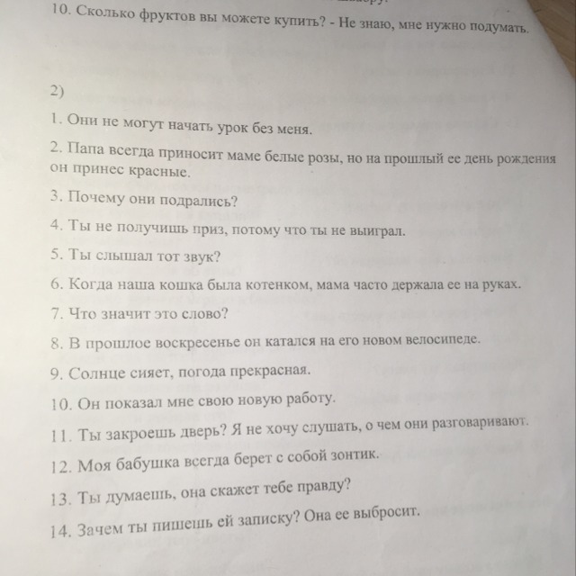 They can't start class without me. 2. Dad always brings mom white roses, on her last birthday: he brought red. 3. Why did they fight? 4. You won't get the prize because you didn't win. 5. You heard that sound. 6. When our cat was a kitten, mother often kept it on runes. 7. What does that word mean? 8. He rode his new bike last Sunday. 9. The sun is shining, the weather is beautiful. 10. He showed me his new job. 11. You close the door? I don't want to hear what they're talking about. 12. My grandmother always brings an umbrella. 13. Do you think ona will tell you the truth? 14. Why are you writing her a note? She won't.