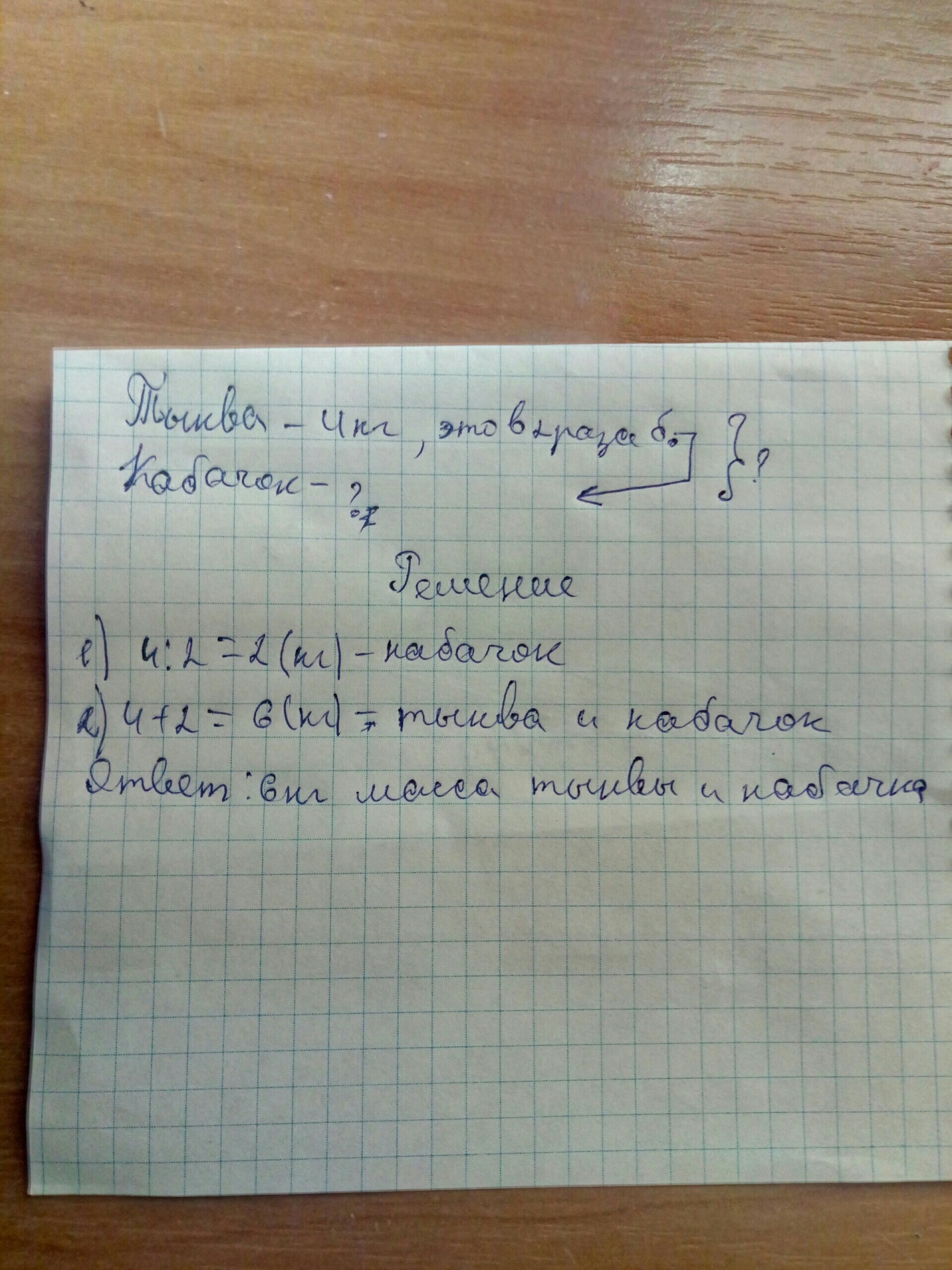 Масса тыквы 4 кг.Это в 2 раза больше,чем масса кабачка. какова масса кабачка и тыквы вместе