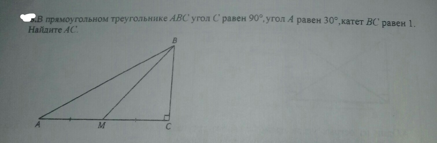 Мы знаем,что BC=1 и угол A=30°,вспомним свойство прямоугольного треугольника с углом в 30 градусов : катет, лежащий напротив угла 30 градусов, равен половине гипотенузы. BC лежит напротив угла в 30° и равен 1, следовательно гипотенуза=AB=2.