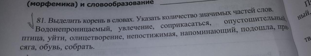 вод-о-не-про-ниц-а-ем-ый- (корни вод и ниц; о - соединительная гласная, не, про - приставки, а, ем - суффиксы, ый-окончание), у-влеч-ени-е корень -влеч-; со-при-кас-а-ть-ся ( корень кас; ся-возвратный суффикс); о-пуст-ош-и-тельн-ый (корень пуст); птиц-а; у-й-ти (корень й ), о-лиц-е-твор-ени-е ( корни лиц и твор; е - соединительная гласная); не-по-стиж-им-ая ( корень стиж); на-помин-а-ющ-ий (корень помин); подо-ш-л-а (корень ш); при-сяг-а (корень сяг); обувь(????)- все слово корень, со-бр-а-ть (корень бр)