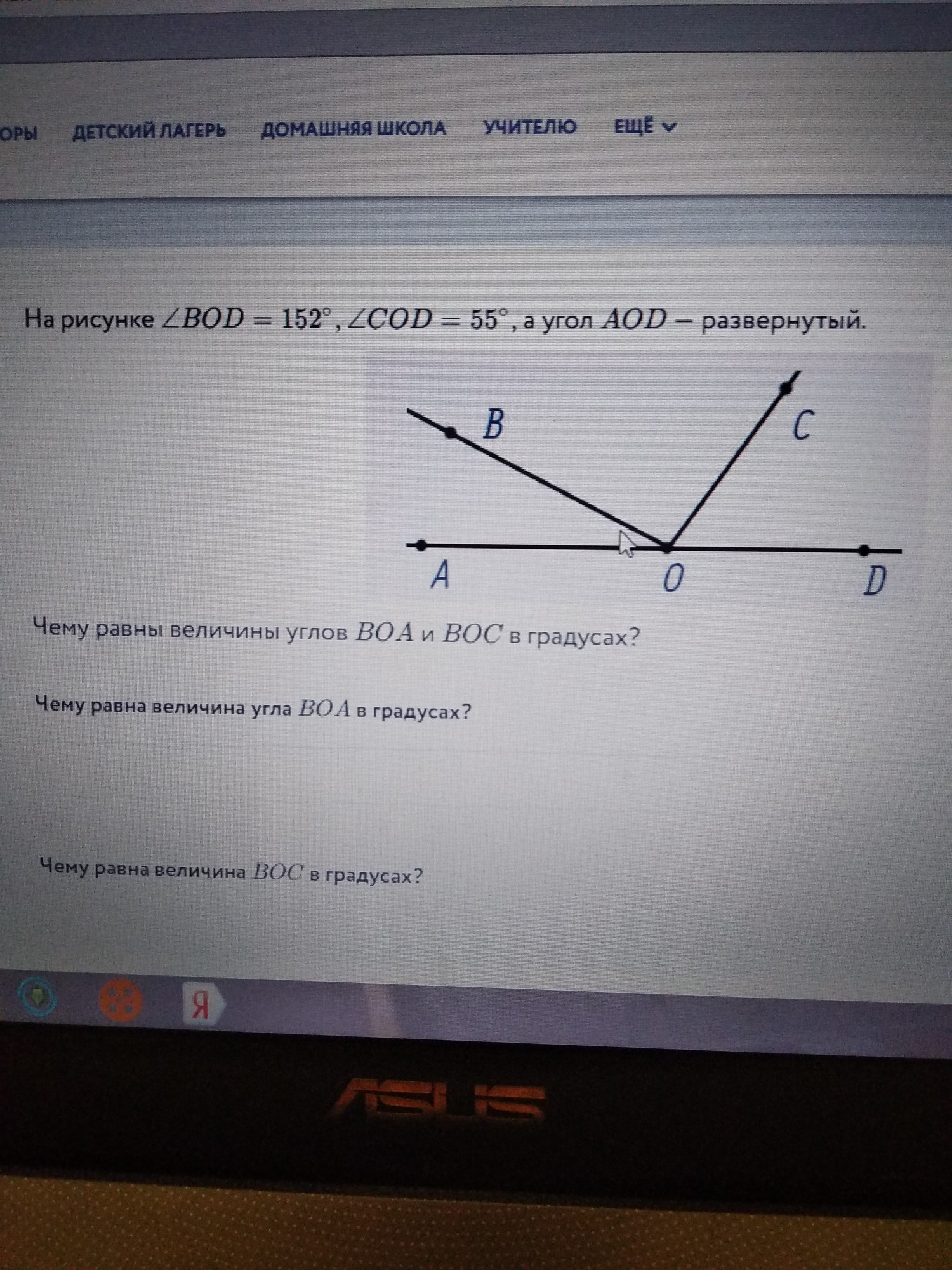 угол АОD -развёрнутый, его величина = 180 градусов, угол АОД=АОВ+ВОД , 180=Х+152 Х=180-152=28, угол АОВ=28 гр.