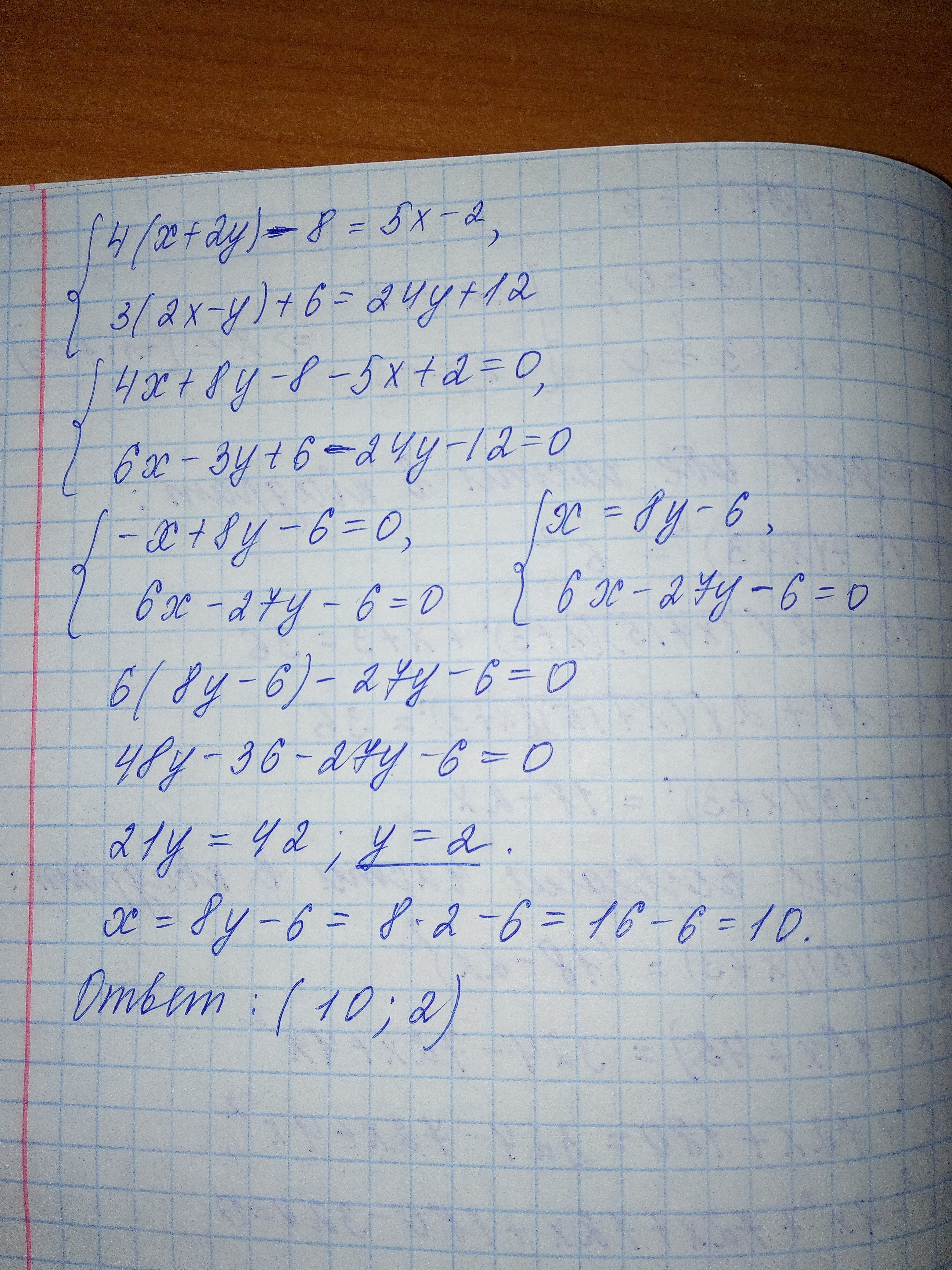 В первом мы нашли х=8у-6,подставляем вместо 'х':