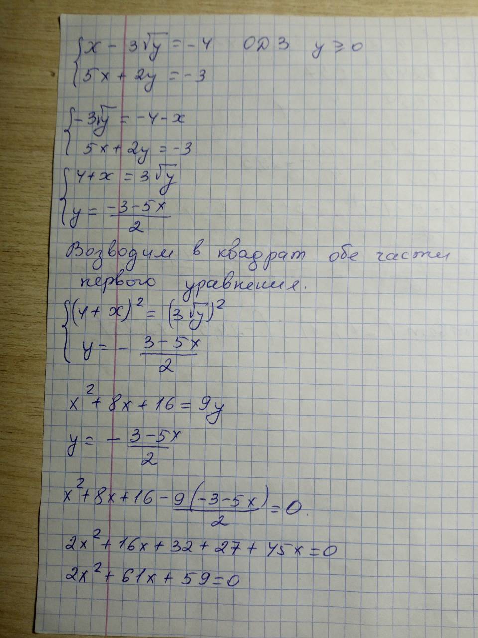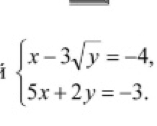 Ещё раз. Гораздо проще Корень(у)=u. После несложных преобразований получим 2*u^2 + 15*u -17=0 Корни u=-8.5 u=1, значит у=1. Подставив в 2 получим х=-1. Ответ (-1,1)