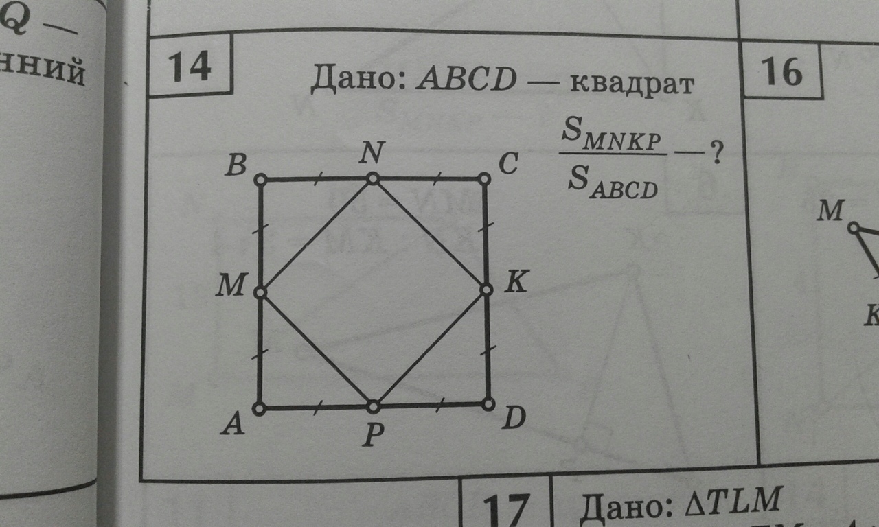 Проведём МК и NP. Видно, что большой квадрат это 8 маленьких треугольников, а маленький квадрат - 4. Значит его площадь в 2 раза меньше, то есть S1/S2=1/2