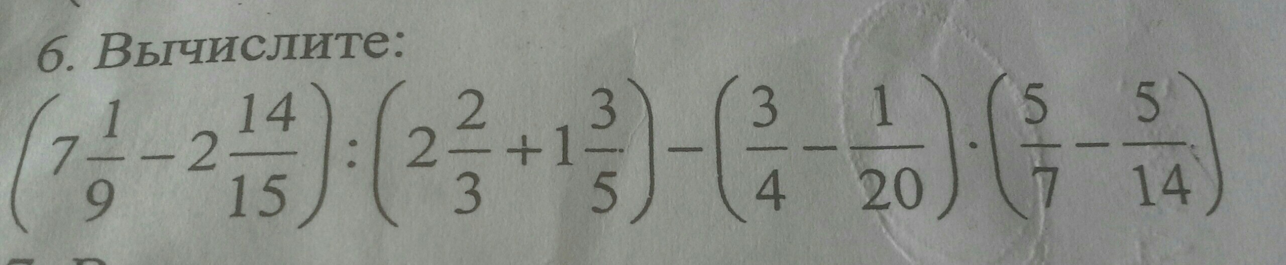 (7 1/9 - 2 14/15) / (2 2/3 + 1 3/5) - (3/4 - 1/20) * (5/7 - 5/14) =