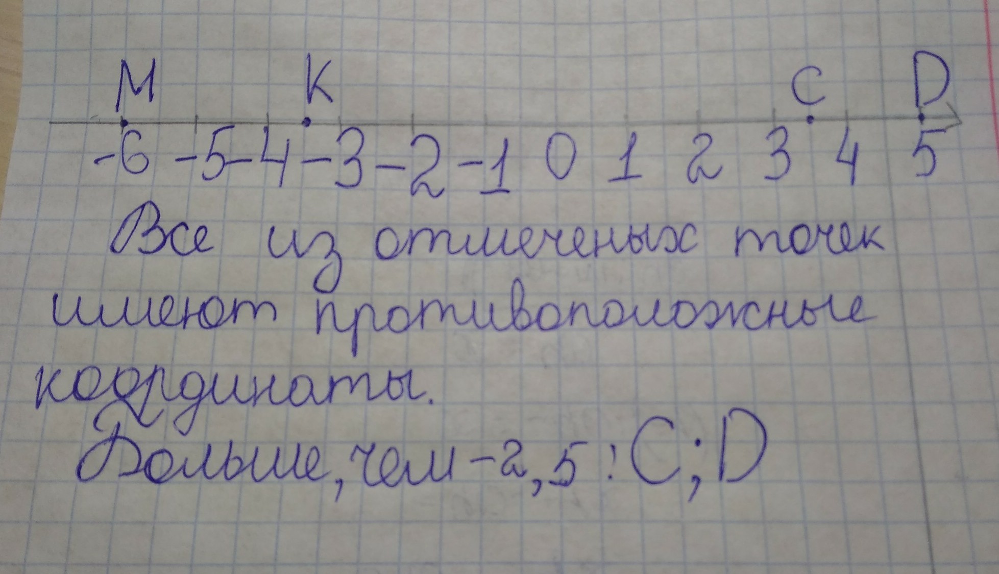 Отметьте на координатной прямой точки М(-6), K(-3,5),D(5),C(3,5). Какие из отмеченных точек имеют противоположные координаты? Назовите какую-нибудь точку с координатой больше, чем -2,5