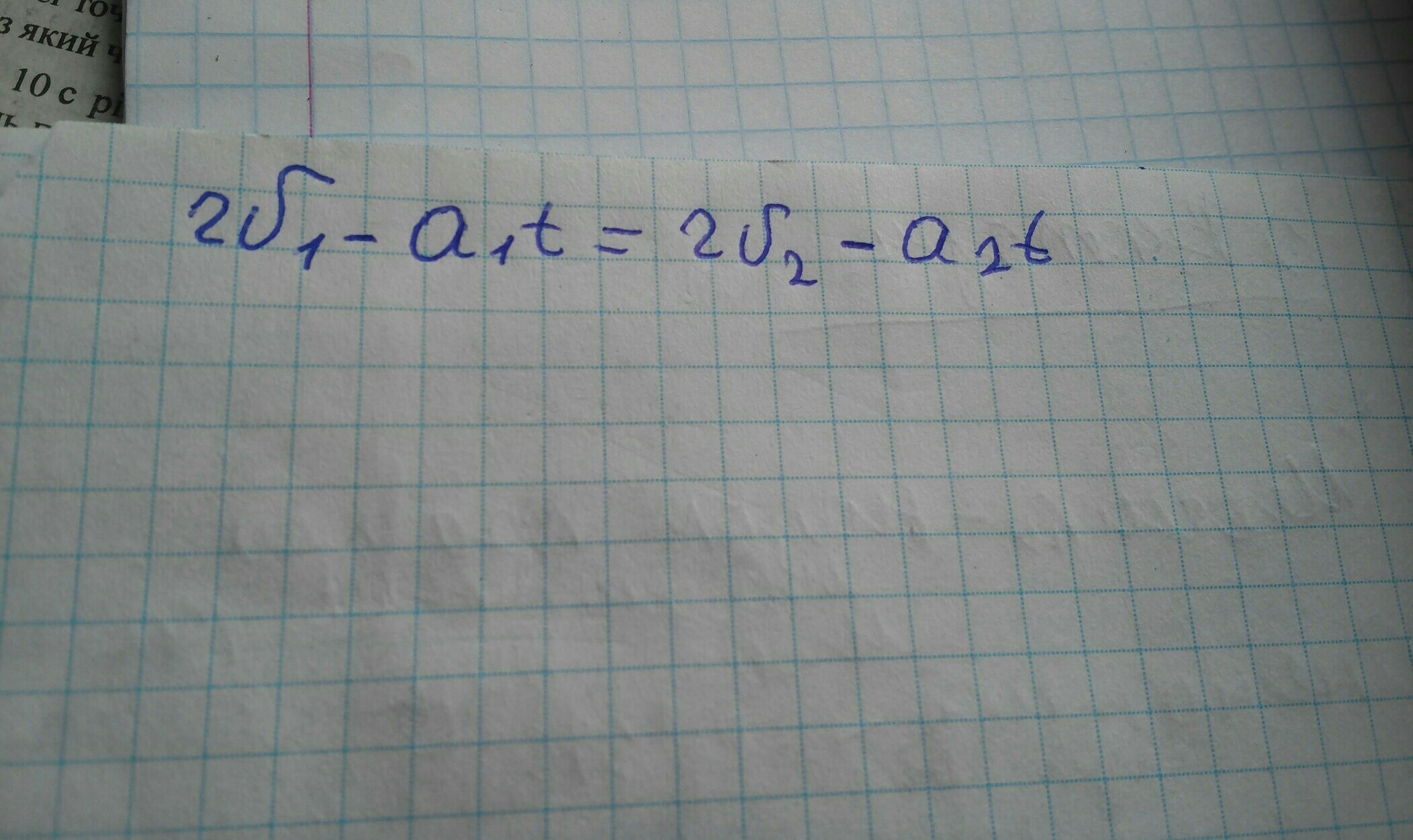 displaystyle 2v_1-a_1t=2v_2-a_2t\<br />2v_1-2v_2=a_1t-a_2t\<br />2v_1-2v_2=t(a_1-a_2)\\<br />t=frac{2v_1-2v_2}{a_1-a_2}