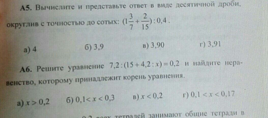 A5. (1цел3/7+2/15):0,4=(10/7+2/15):4/10=10/7•10/4+2/15•10/4=25/7+1/3=(25•3+1•7)/21=82/21=(округлённо)=3,90 в).