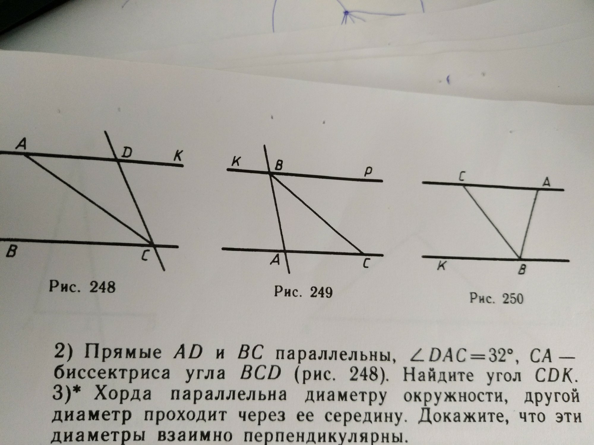 прямые AD и BC параллельны угол DAC равен 32 градуса cа биссектриса угла B C D рисунок 248 Найдите угол cdk