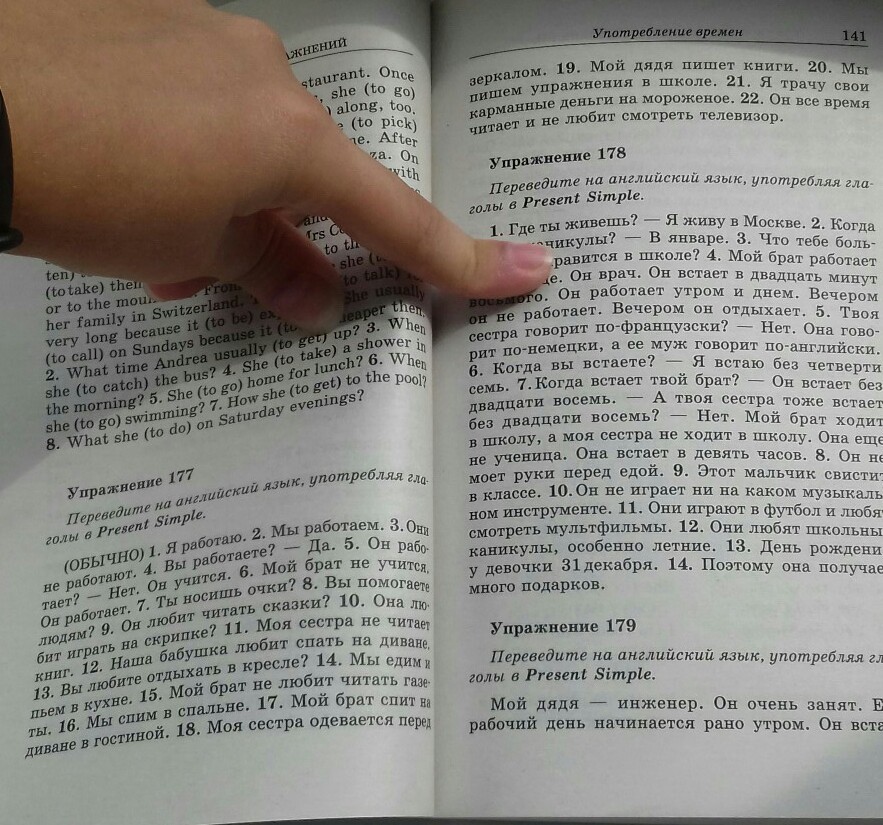 1. I work. 2. We work. 3. They don't work. 4. Do you work? - Yes, we do. 5. Does he work? - No, he doesn't. He studies. 6. My brother doesn't study. He works. 7. Do you wear glasses? 8. Do you help people? 9. Does he like reading fairy-tales? 10. Does she like playing the violin? 11. My sister doesn't read books. 12. Our grandmother likes sleeping on the sofa/couch. 13. Do you like resting in the arm-chair? 14. We eat and drink / have our meals in the kitchen. 15. My brother doesn't like reading newspapers. 16. We sleep in the bedroom. 17. My brother sleeps on the sofa in the living room. 18. My sister gets dressed in front of the mirror. 19. My uncle writes books. 20. We write exercises at school. 21. I spend my pocket money on ice cream. 22. He reads all the time and doesn't like watching TV.