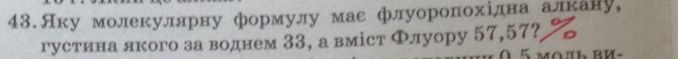 яку молекулярну формулу має флуоропохідний алкану,густина якого за воднем 33,а вміст Флуору 57,57%